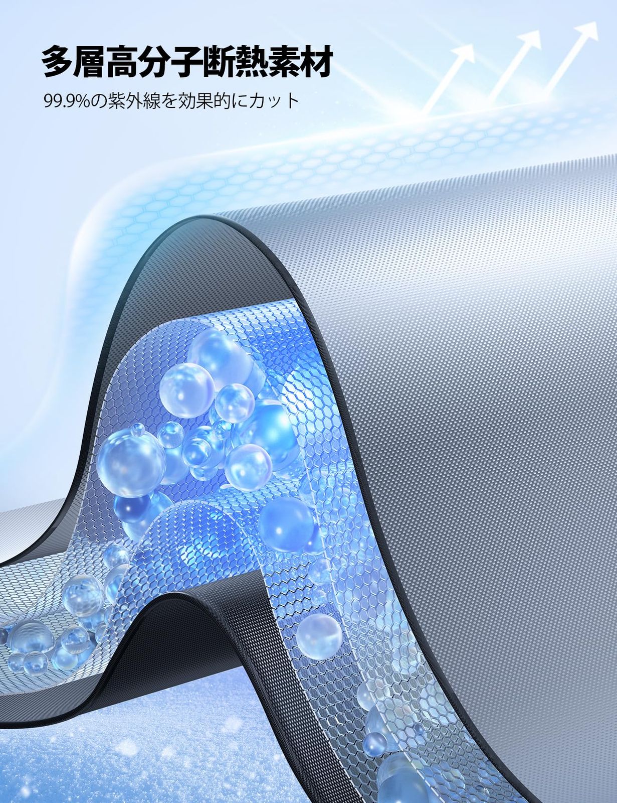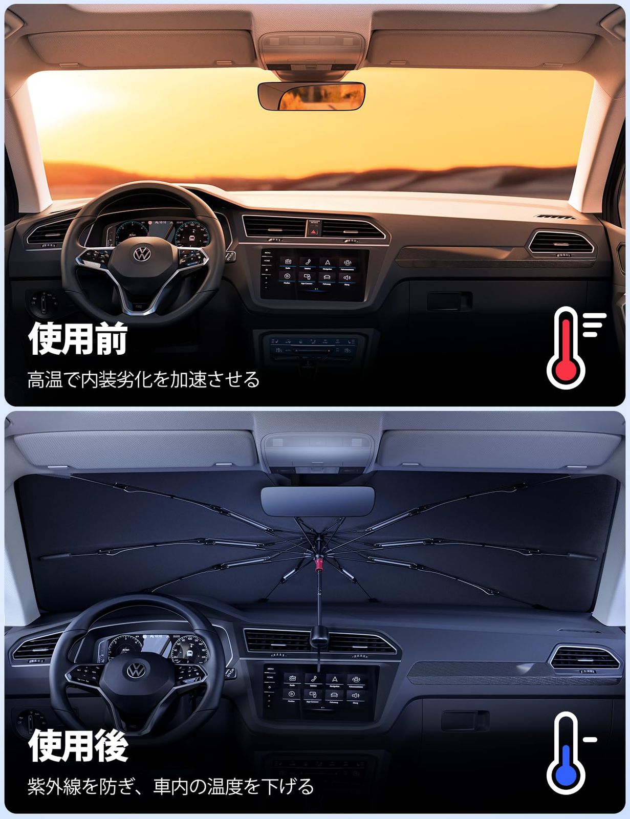 ??【5層高分子断熱材料・99.9%以上UVカット】夏には、紫外線を防ぎ、車内の温度を下げることを目指します。フロントサンシェードの傘面は6層ナノ高分子断熱材料を採用し、外側はチタンシルバーコーティングで、強い日差しを反射して車内温度の上昇を抑え、約99%以上の紫外線を効果的に遮断しますので、外気温が上昇しても、駐車中の車内を涼しく保ち、ひどい暑さを防げます。蒸し暑い車の環境に悩まされることはなくなります。 内装劣化防止、ダメージや経年劣化を防ぎます。駐車時の大事な車を太陽光による損傷やハンドル焼け、ダッシュボードなどの樹脂部分の日焼けからしっかりご愛車を守ります。駐車の度に気持ちをより涼しくしてくれます。