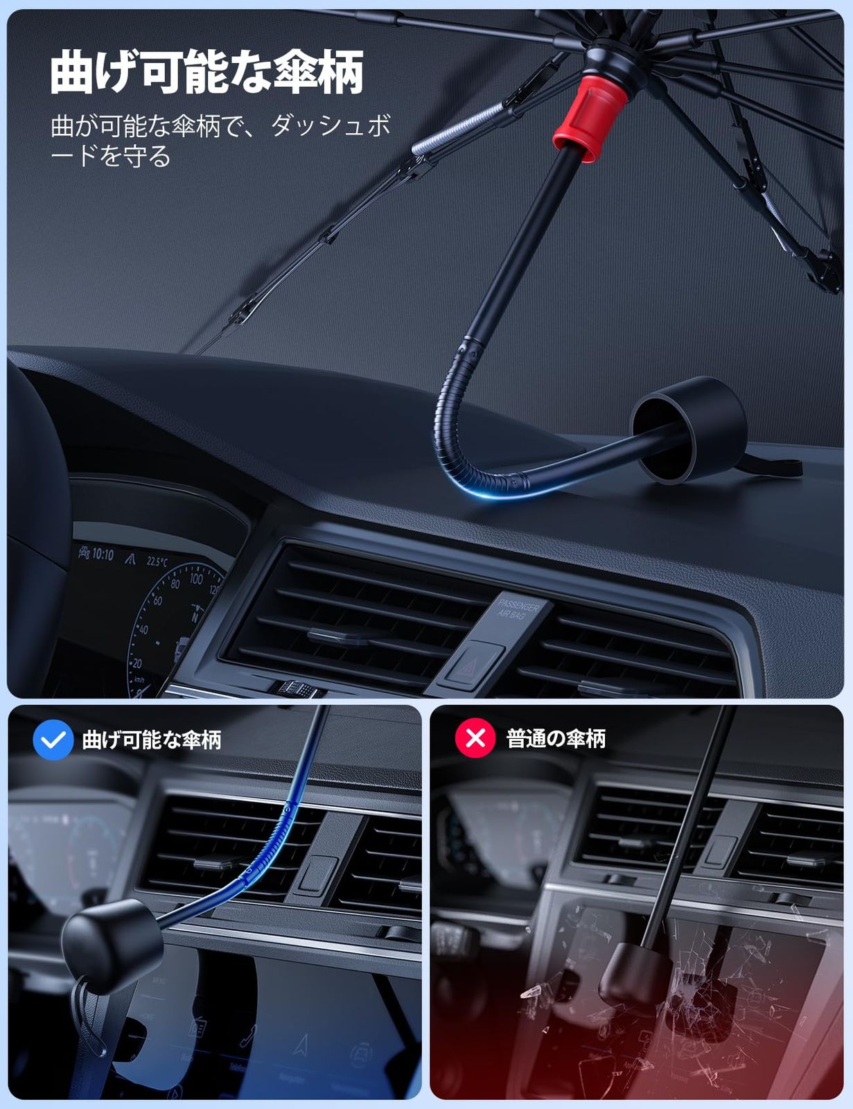 ??【曲がる可能な傘柄・ダッシュボードを守る】ユニークなデザインが採用されます。ダッシュボードの高低により、傘柄を折り曲げて調整できます。金属の傘柄がダッシュボードに触れないように、その摩擦からダッシュボードが守られます。また、ガラスと接触する四隅にプラスチックの保護カバーがあり、ガラスを傷つけませんのでご安心ください。