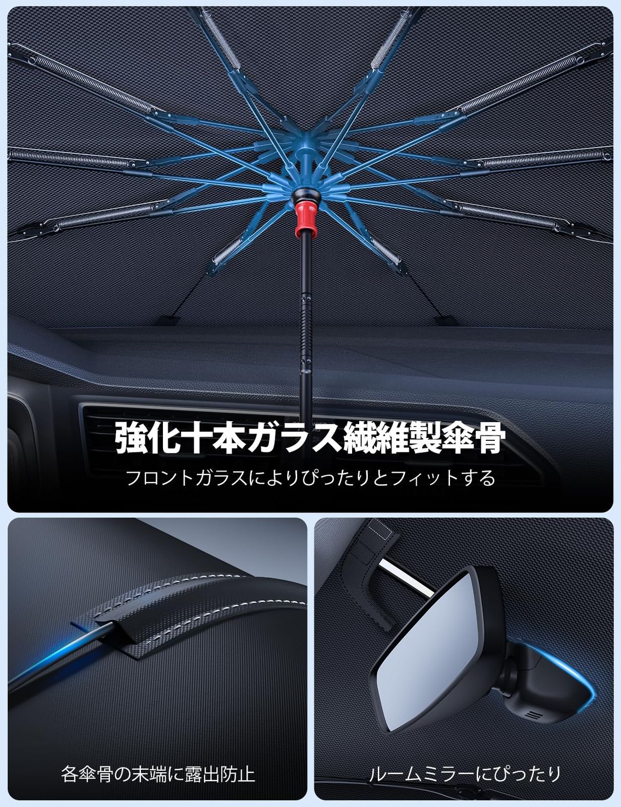 ??【頑丈なガラス繊維製傘骨・傘骨露出防止】各傘骨の末端に露出防止のデザインにより、車の内装に傷つける心配はありません。傘骨は強さ、耐熱性、耐食性のバランスが完璧なガラス繊維が採用され、製品の安定性を効果的にする同時に、柔軟性もあってかなり頑丈で壊れにくいです。夏の高温下でも問題なく使用できる。10本の傘骨は車のフロントガラスに完全にフィットし、隅々まで紫外線を遮断できます。また、カーサンシェードの各傘骨の末端に露出防止のデザインにより、車の内装に傷つける心配はありません。