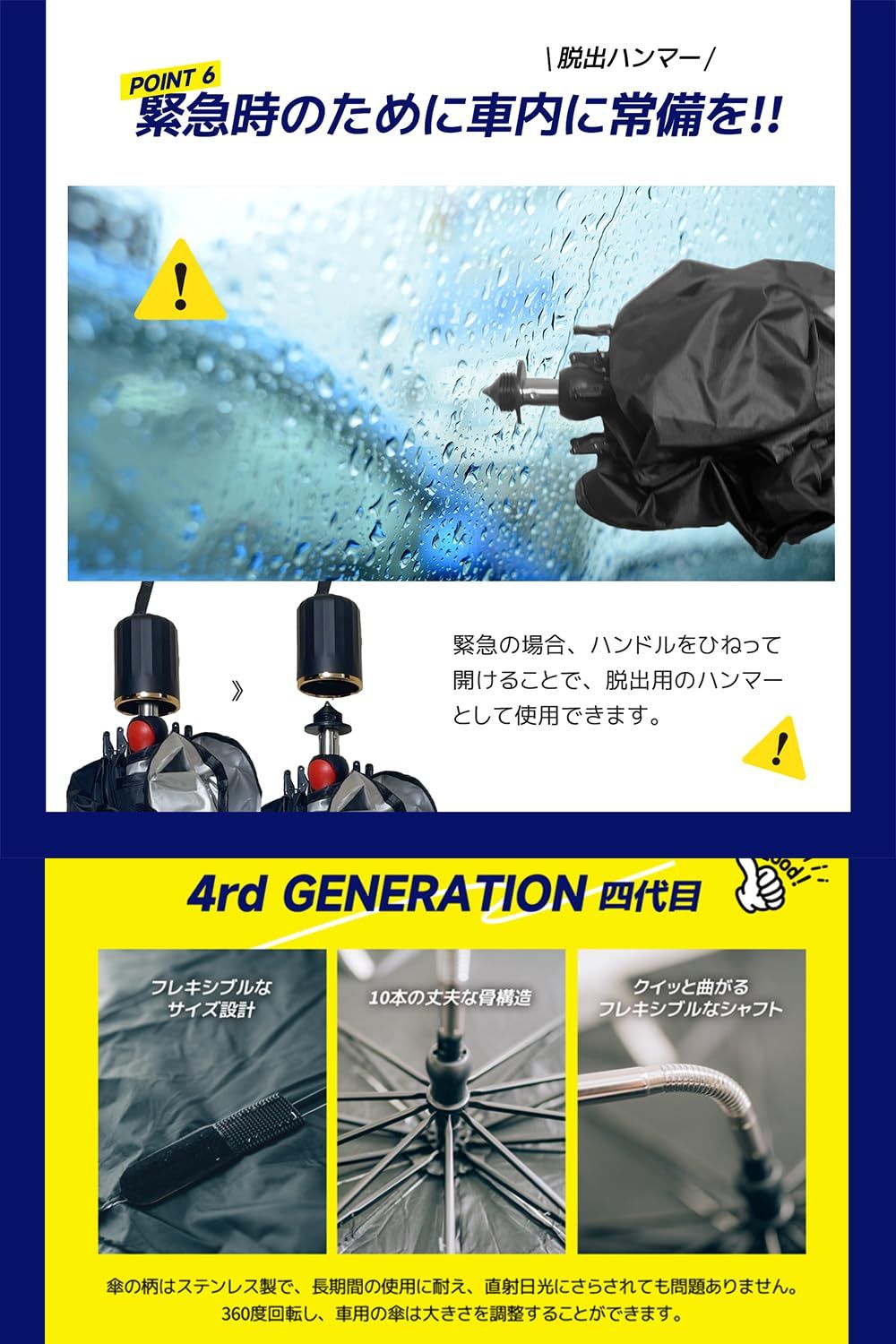 ??【屈曲可能な傘の柄・ダッシュボード保護デザイン】独自のデザインを採用。ダッシュボードの高低に合わせて、傘の柄を折り曲げて調整することができます。金属製の傘の柄がダッシュボードに接触しないようにして、ダッシュボードを摩擦から保護します。また、ガラスと接する四隅にはプラスチックの保護カバーが付いており、ガラスを傷つけることはありませんのでご安心ください。