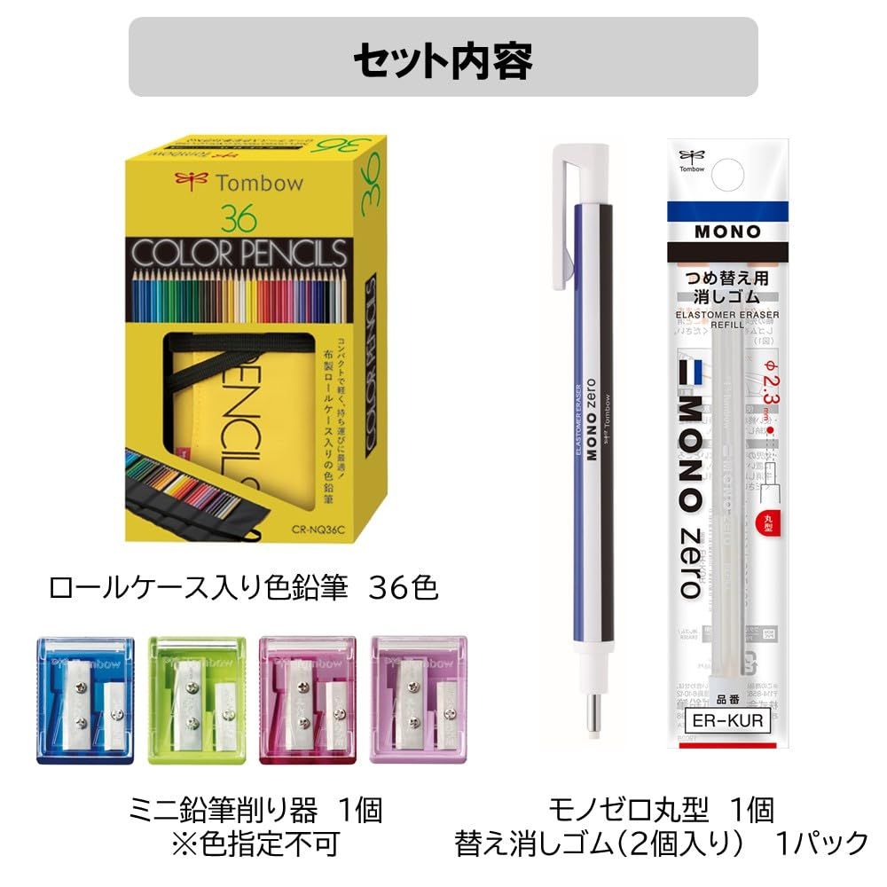 本製品は、色鉛筆36色セット (ロールケース入り / 鉛筆削りつき) と ペン型消しゴム モノゼロ (丸型 / 本体+詰替え) のセットです