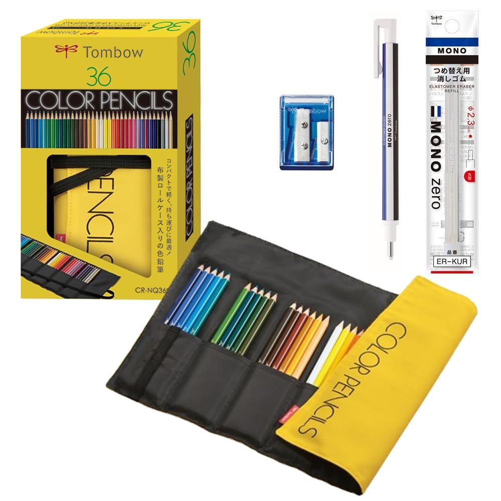 トンボ鉛筆 色鉛筆 36色 ロールケース入り ミニ削り器付き MJ-CRNQ36CQAAZ & 消しゴム ペン型 MONO モノ ゼロ 丸型 本体1本+替え1パック(2本入) JCB-232AZ