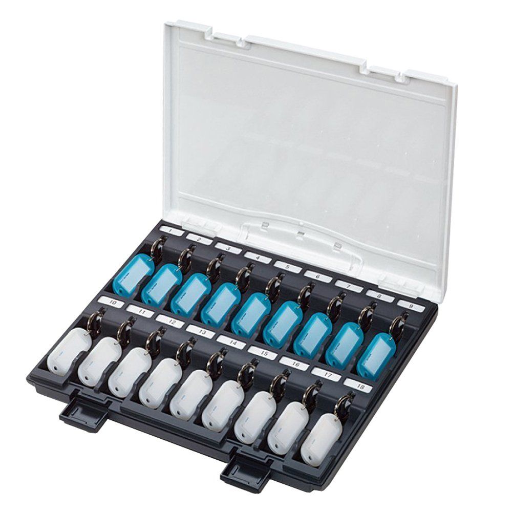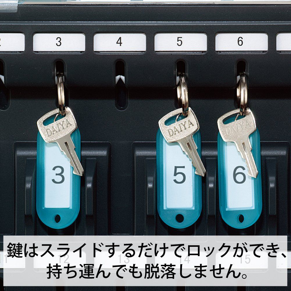 ●付属のキーホルダー型名札を18個まで収容可能。鍵はスライドするだけでロックができ、持ち運んでも脱落しません。