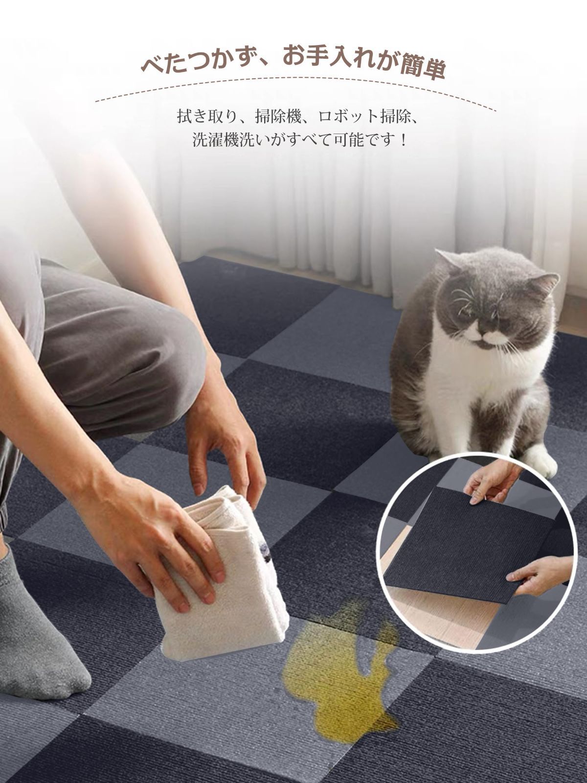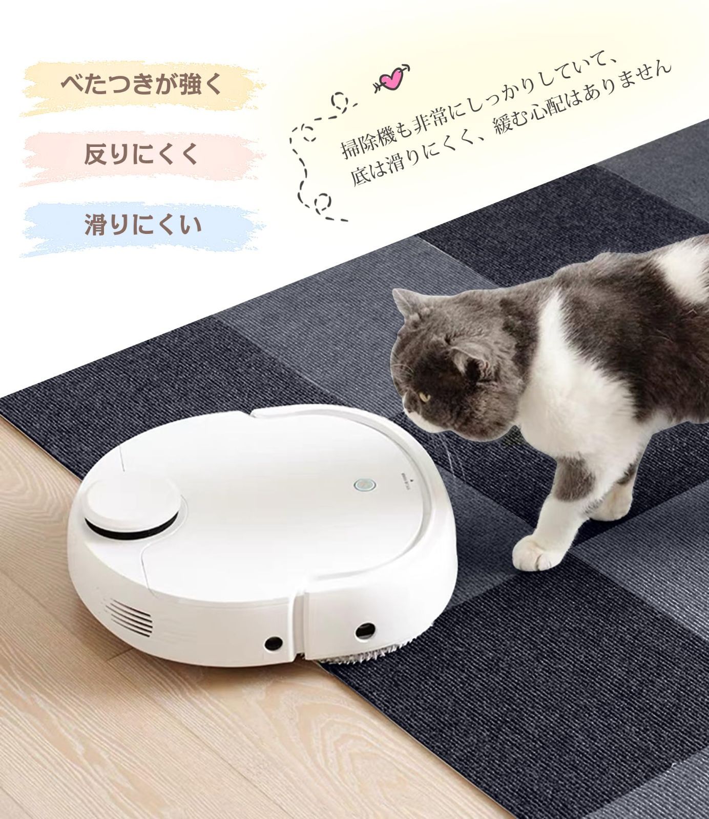 【ずれない 吸着タイルカーペット】床と接触面はアップグレードされたTPR素材、従来品より吸着性UP、耐久性もあり、上で走り回っても、掃除機をかけても、ずれにくくストレスがありません。厚み約4mmのマットですので、つまずきにくく、扉の開閉の妨げにもなりません。剥がすときに縁からしたら、簡単に床から外れるし、床にのりの残りや痕跡がなく、繰り返し使用ができます。高齢者や老犬は足腰が弱くなり、滑り止め対策として良いものです。