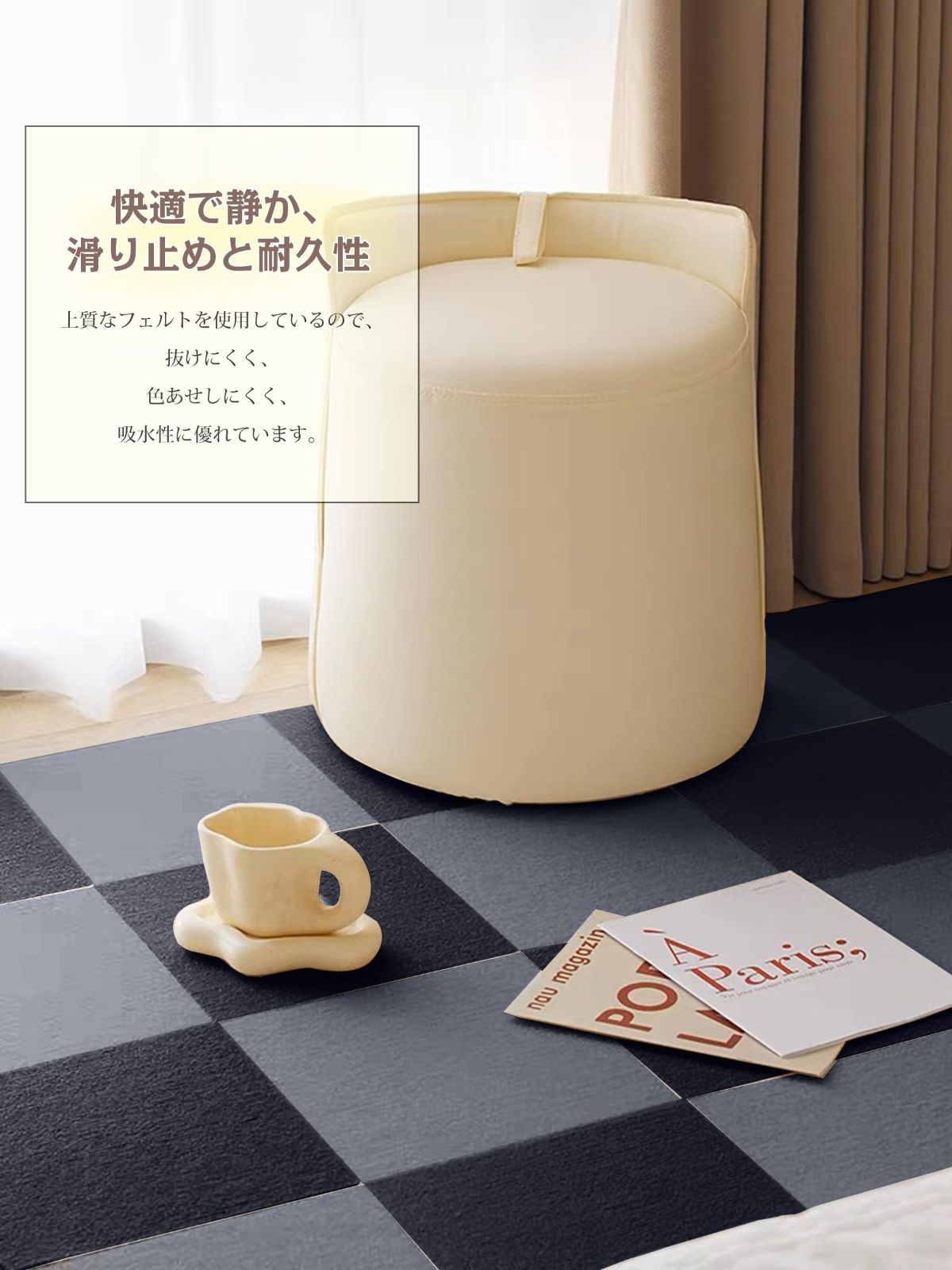 【設置簡単 カスタマイズ出来る】ジョイントマットを必要な分だけ敷き並べていくだけで、簡単にお部屋のイメージを変えることができます。ハサミで手軽にカットでき、隅々までピッタリ貼れます。床暖房の上に置けば、寒い冬でも暖かく過ごせます。 また、お部屋の大きさや形に合わせてぴったり設置できます。リビングのカーペットとして、キッチンの滑り止めマットとして、玄関の汚れ防止マットとして、廊下の防音マットとしてなど、様々な場所でお使いいただけます。