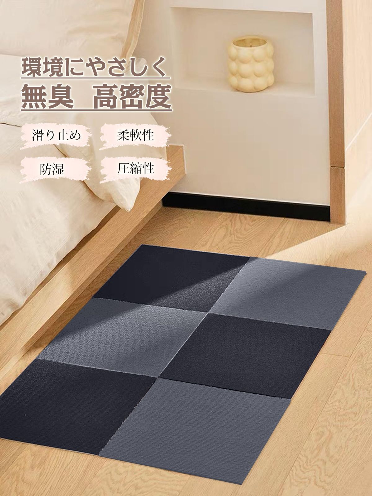 【敷く場所は自由自在】カーペットを敷いた床は保温性あり、防音性、遮音性に優れ、ホコリも舞上がりにくくて、ずれないという特性があります。使用場所が多い:玄関周り(自転車や椅子などの床キズ.汚れ防止に便利。) 廊下(老犬や高齢者は足腰が弱くなり、滑り止め対策として) キッチン(ガラスや陶器の食器を落とした場合には、衝撃を吸収してくれるので割れにくい) 室内(落下音や椅子を引く時の衝撃音を吸収軽減するため、防音対策に最適)など。並べ方や 色を飾ったり組み合わせたりすることで、お部屋の印象を変えることができます。