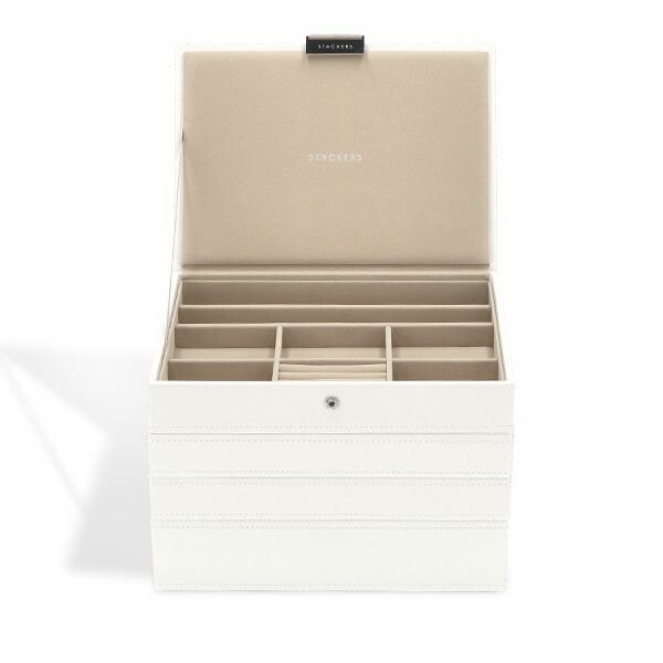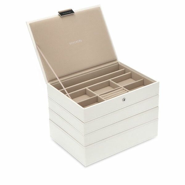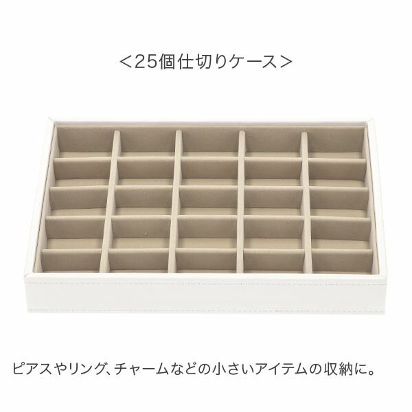 様々なサイズの収納スペースがあり、リング・イヤリング・ピアス・ブレスレット・ネックレスなど、各スペースに合わせて美しく整理して収納できる蓋付きボックス。こちらの2、3、4段目をお好きな組み合わせでお選びいただけます。