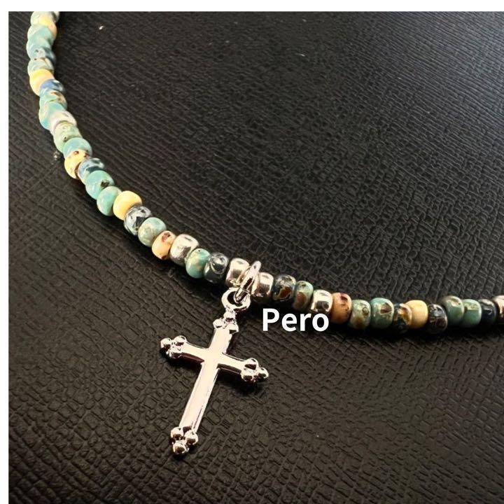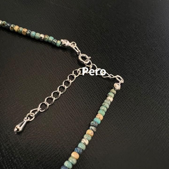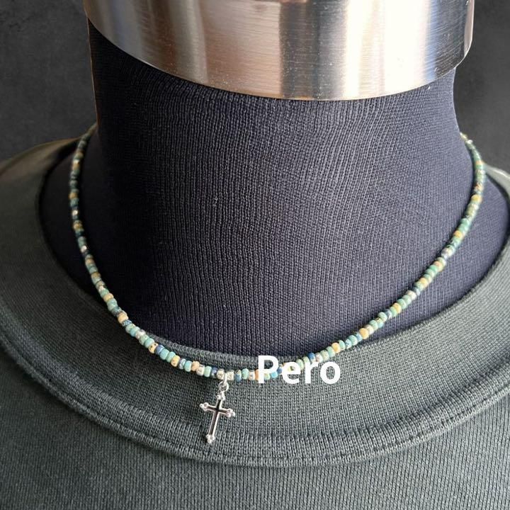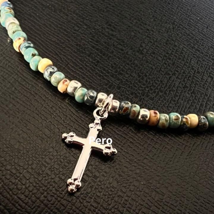 オリジナルのターコイズブルーミックスのビーズチェーンを使用したクロスネックレスです。