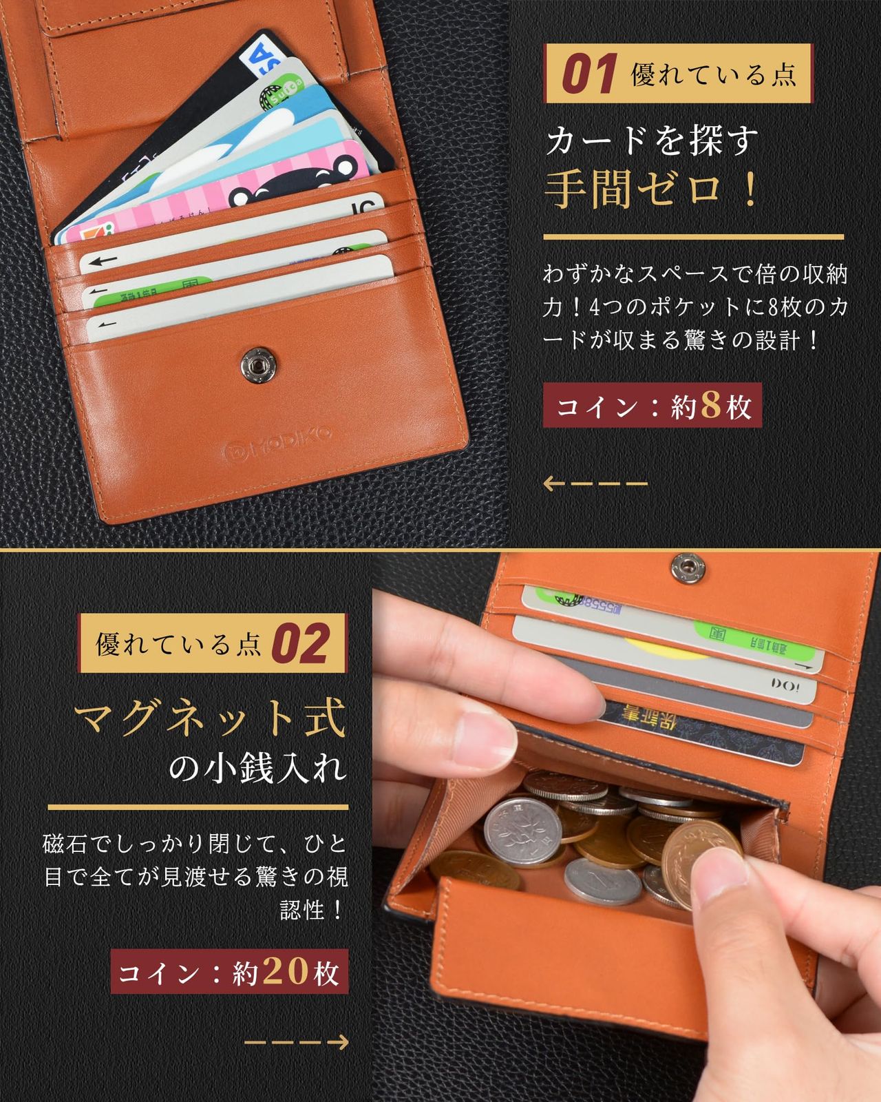 ?? 小さなボディに驚異の収納力!「手のひらサイズでありながら、驚愕の収納力を実現!4つのカードポケットで最大8枚のカード、コイン20枚、紙幣10枚が楽々収納できる!財布 メンズ 小銭入れ付きで、すべての必需品をしっかり整理。コンパクトながらも収納力が高く、日常のアイテムを完璧に収められます。」