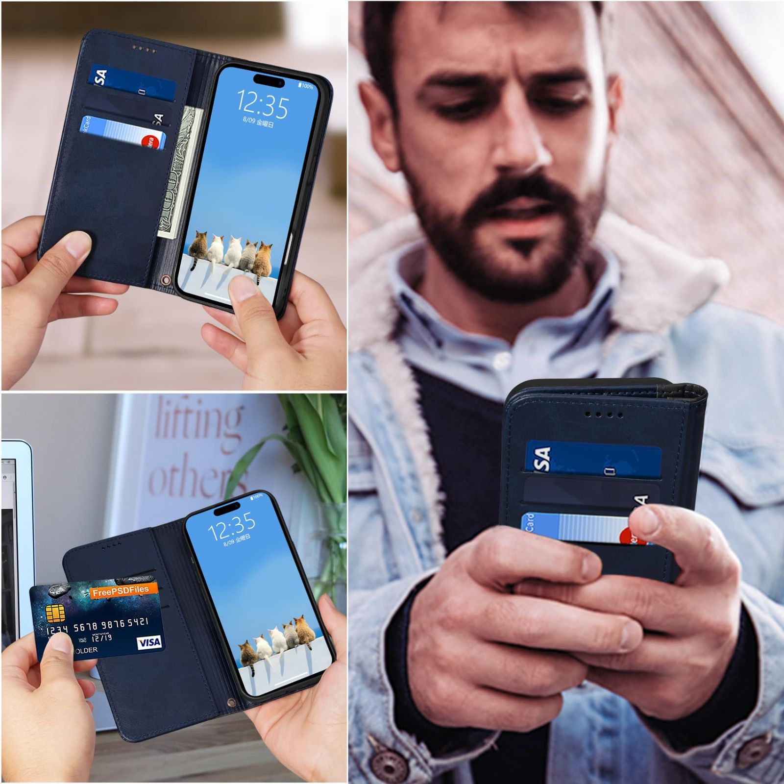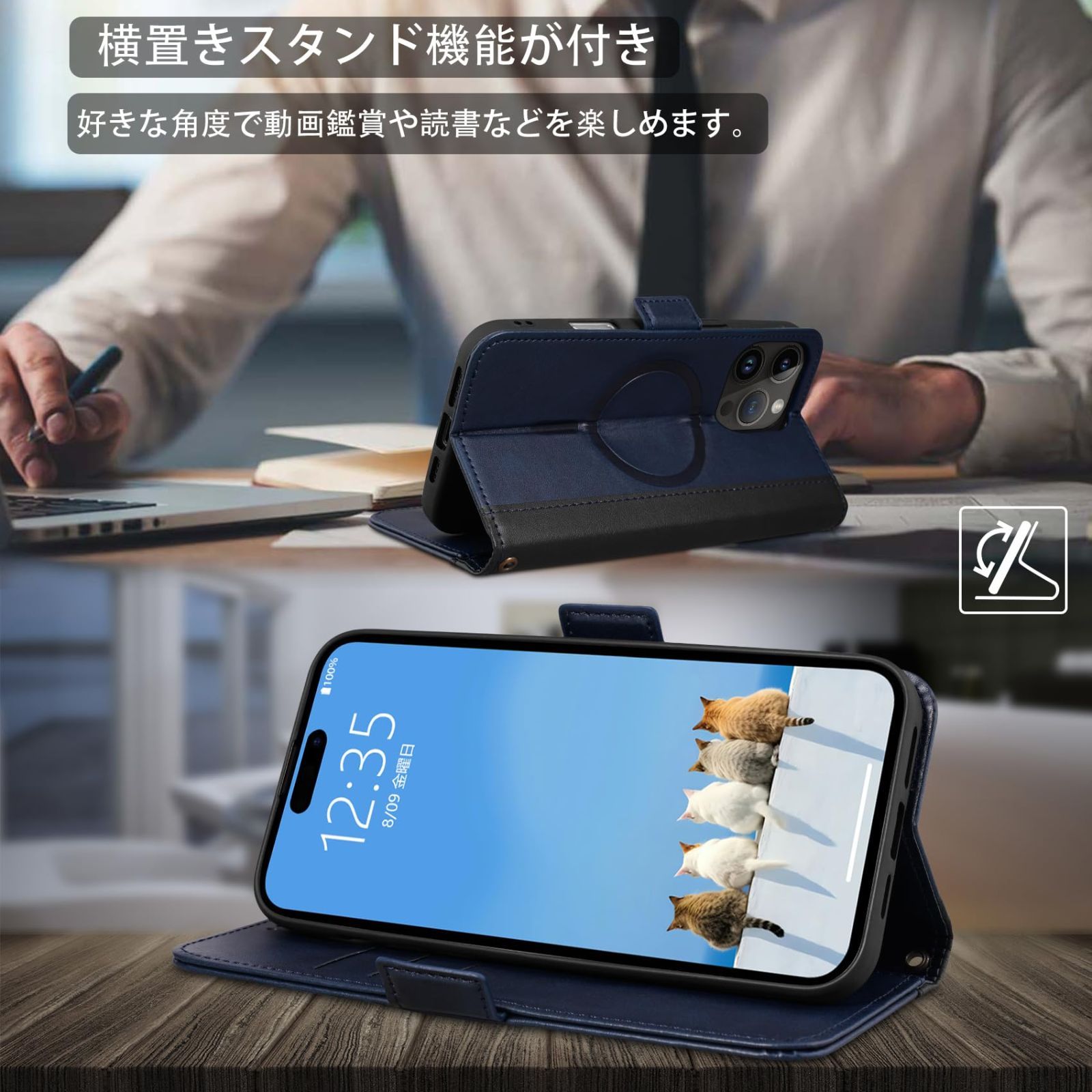 横置きスタンドと収納力:横置きスタンド機能が付いて、好きな角度で動画鑑賞や読書などを楽しめます。アイフォン16 プロマックス 用 ブック型ケースとして、内側には三つのカード入れとフリーポケットがつき、名刺や定期券の収納に優れているiPhone16 Pro Max 用 手帳型ケースです。