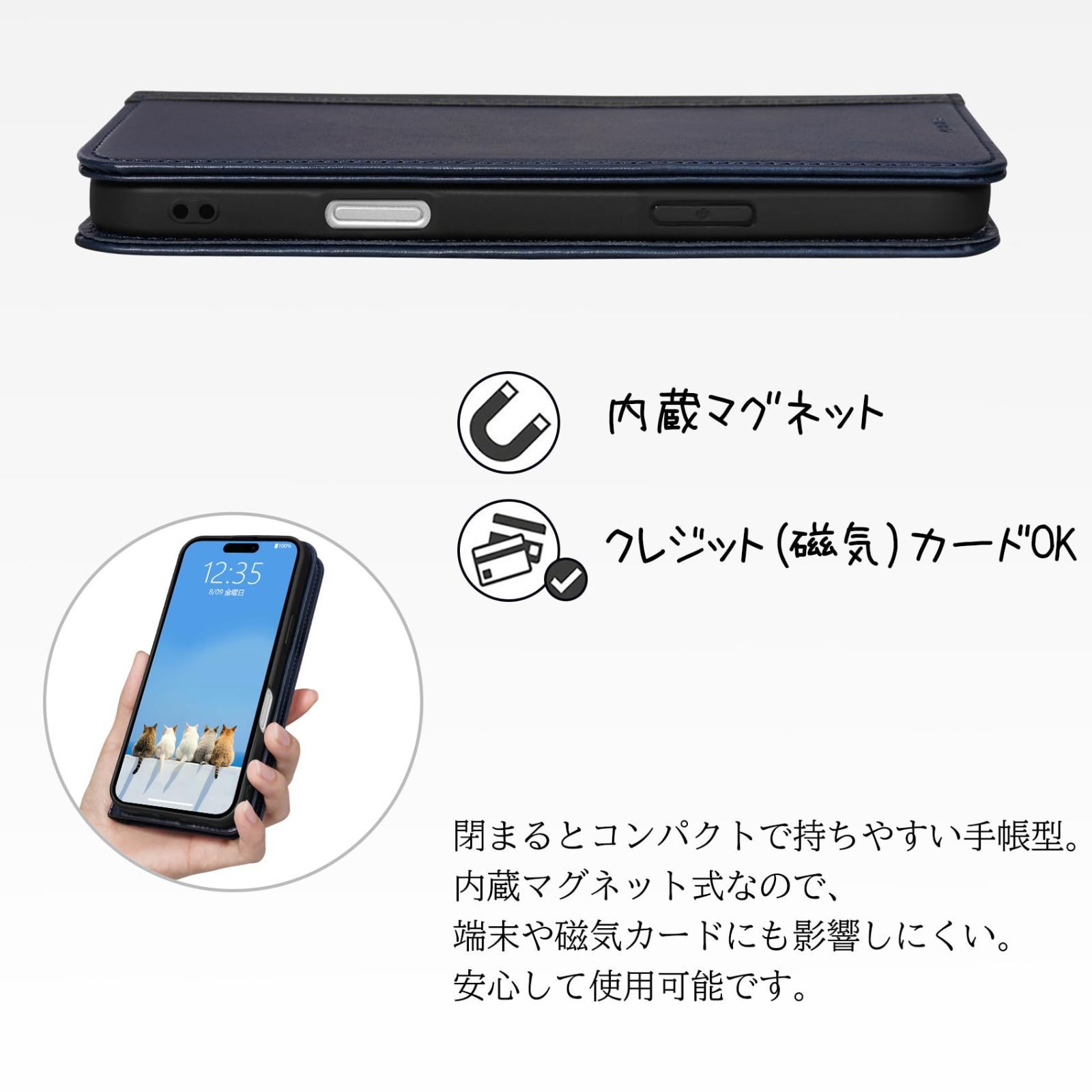 内蔵のマグネット:マグネットが内蔵されてるので、ベルトがなくてもフタがピタッと閉じることが可能。前後に搭載されたマグネットは後ろも合わせられ、スマホケースを使いまま通話やカードの支払いの機能に干渉しません。