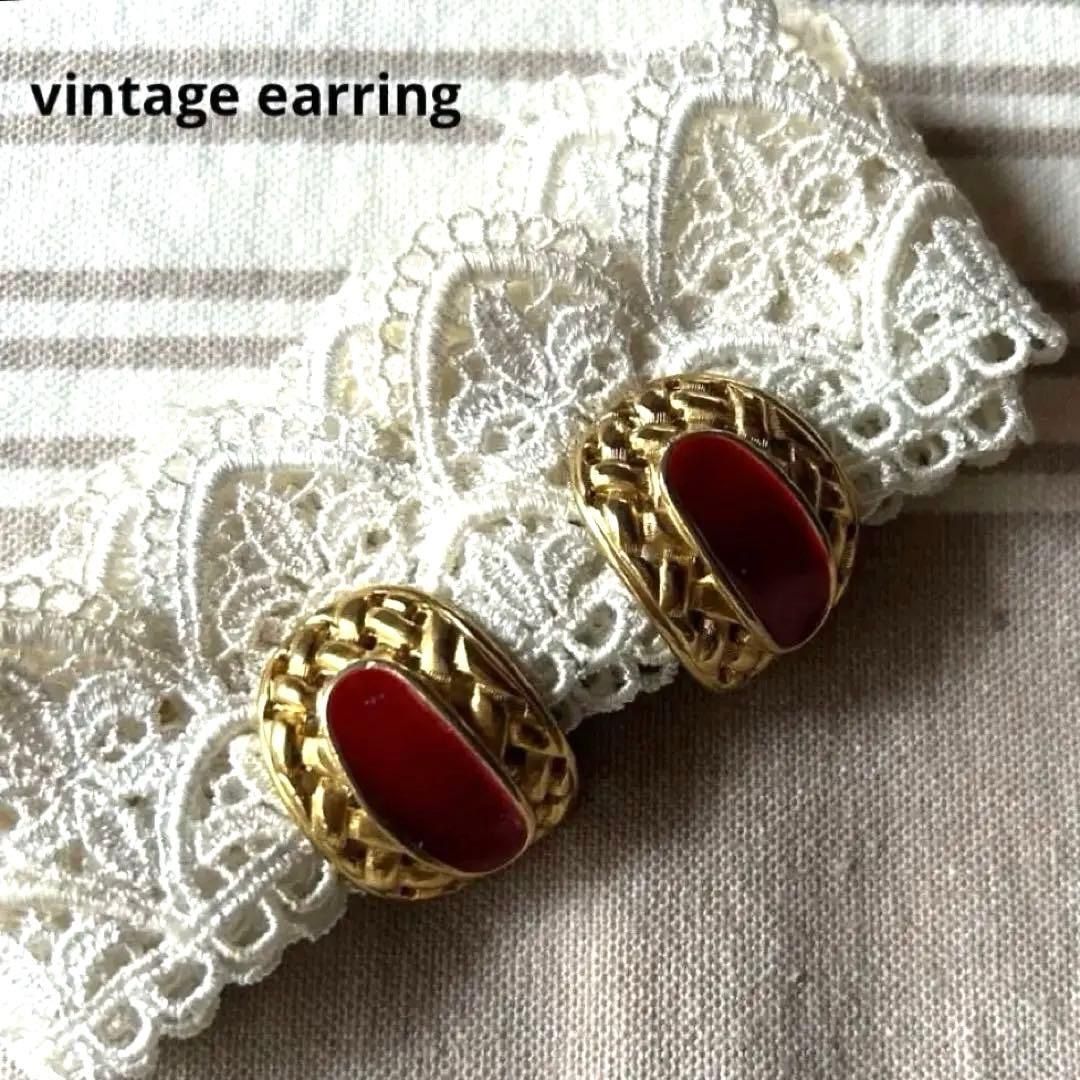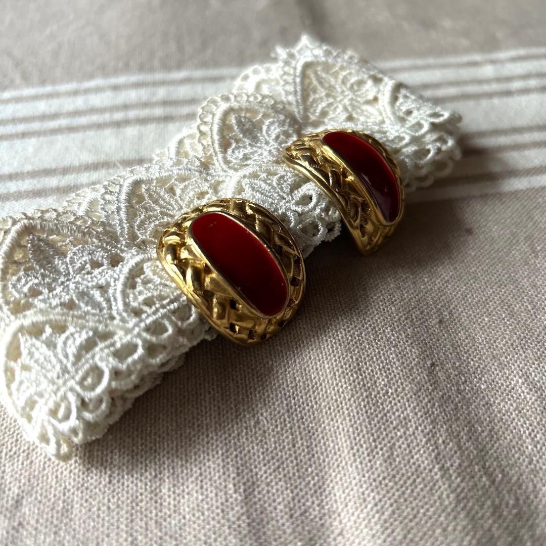 ゴールドのメッシュフレームが赤のエナメルを囲んだビンテージイヤリングです。大振りで存在感があり着けるだけで華やかさを添えるアイテム