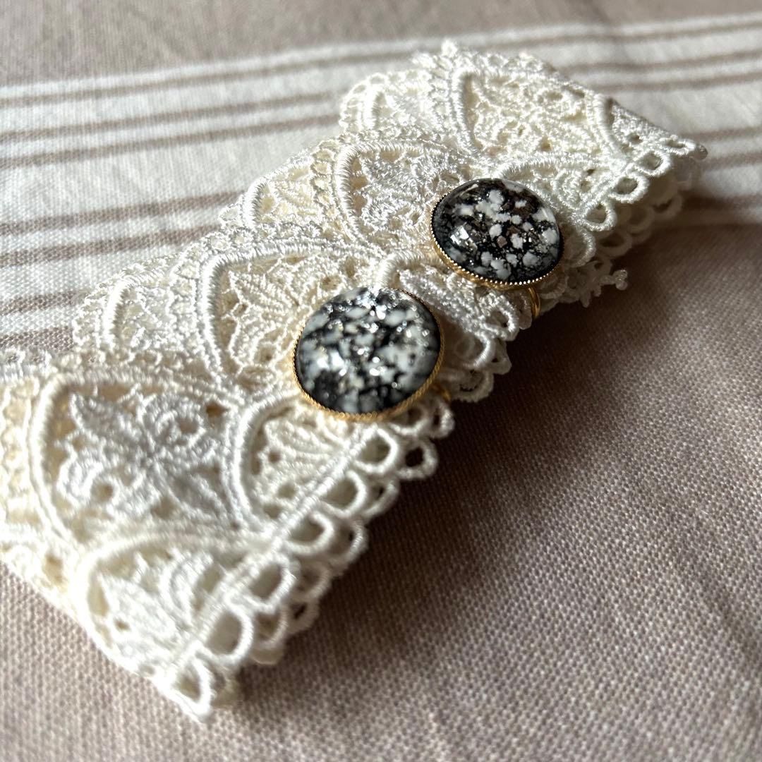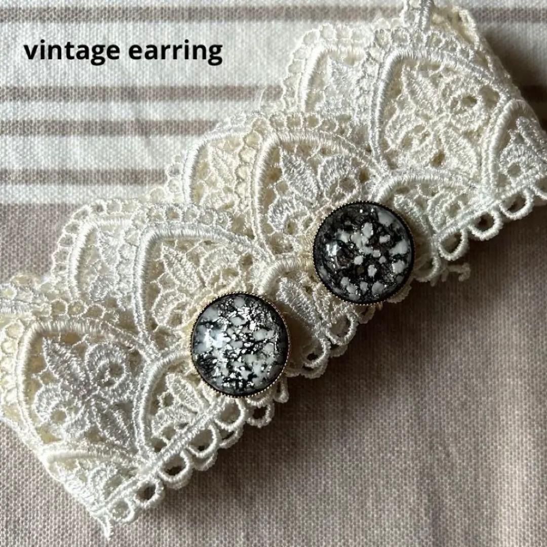 スノードームのような黒のベースにシルバーや白のホロが煌めくビンテージイヤリングです。ぽってりとしたフォルムにクールな色合いがステキなアイテム
