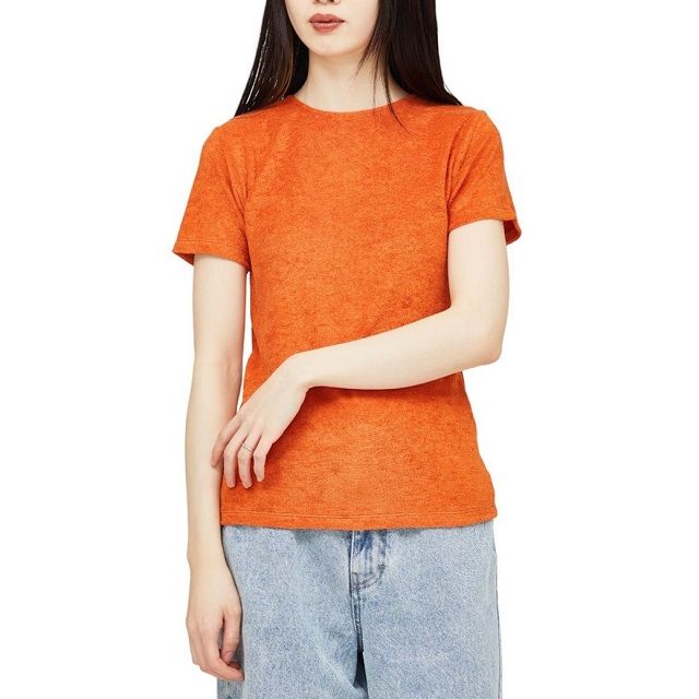 伸縮性のある柔らかなパイル素材が特徴のTシャツで、フィット感のあるシルエット。