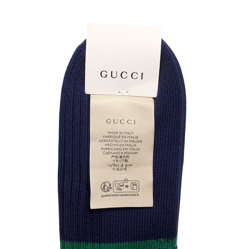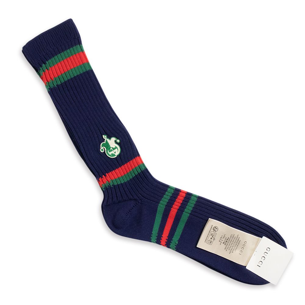 【商品紹介】グッチのアイコニックな配色が目を引く、コットンブレンドのロングソックスです。ネイビーをベースに、ブランドを象徴するグリーンとレッドのウェブストライプが施され、足元にクラシックかつスポーティーなアクセントを添えます。肌触りの良い柔らかな質感で、カジュアルなコーディネートからトラッドなスタイルまで幅広く活躍するアイテムです。