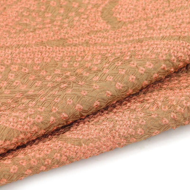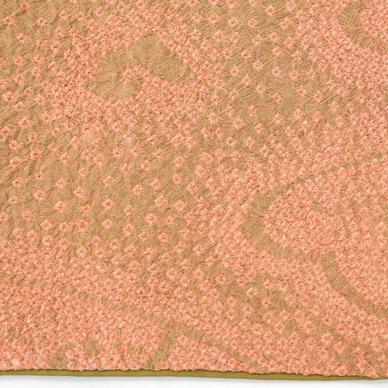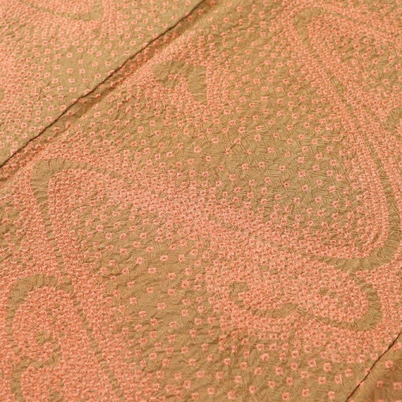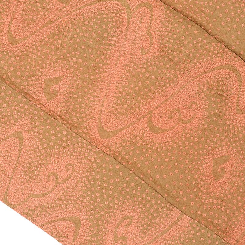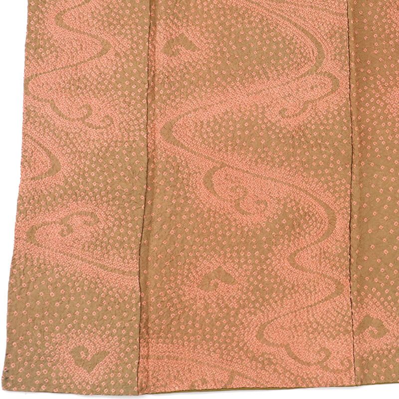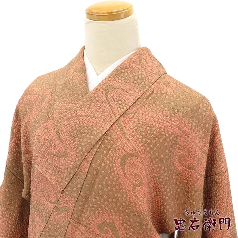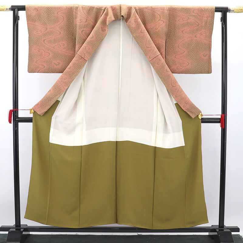 ややピンクみのある薄茶色と灰緑色の絞り小紋。流れる様に柄が表現されており、 抽象的な文様に華かさを感じる小紋です。 独特な和の色を品よく、着こなすことが出来ます。