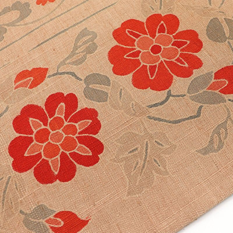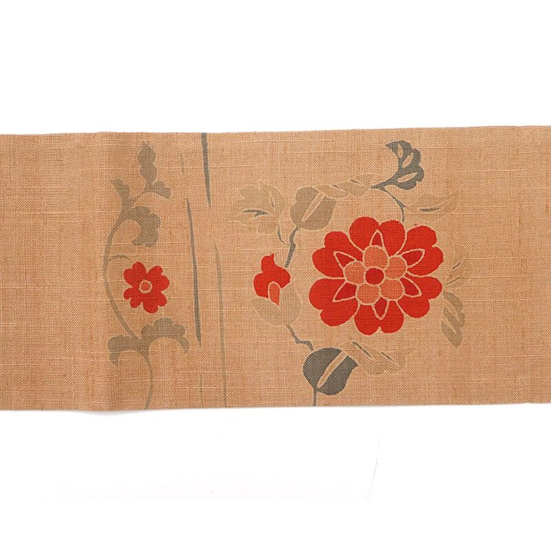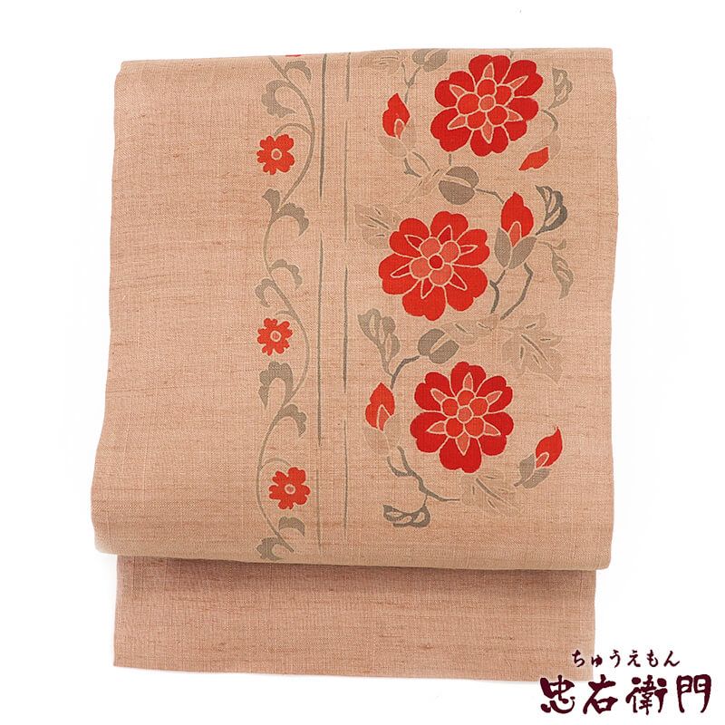 薄茶色に赤とグレーで表現された品の良い名古屋帯。紬の柔らかく、温かみのある雰囲気が美しい帯ですね。紬などの普段着にピッタリです。
