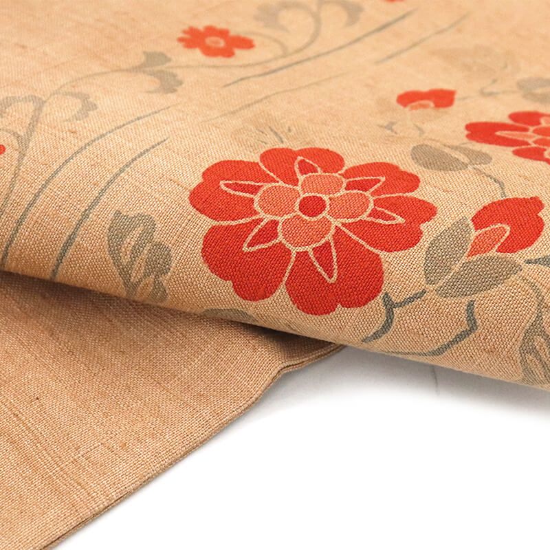 絹(シルク)の生地です。紬地で、やや温かみのある雰囲気。程よい張りで、締めやすそうな質感です。