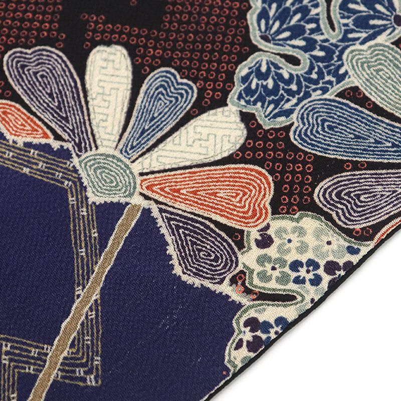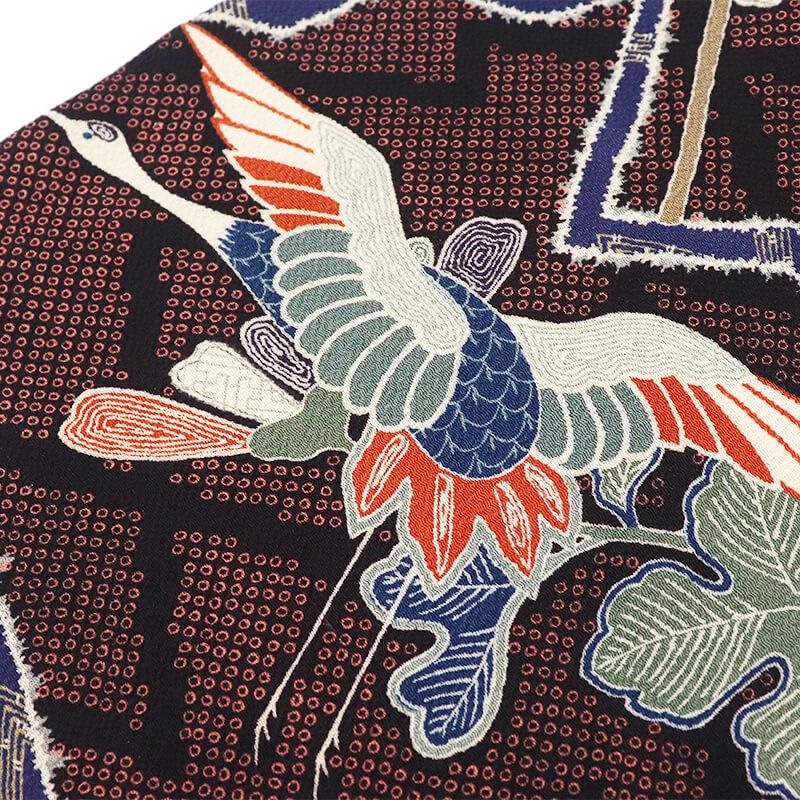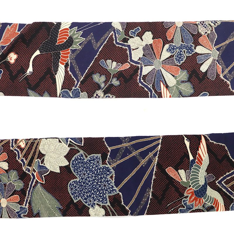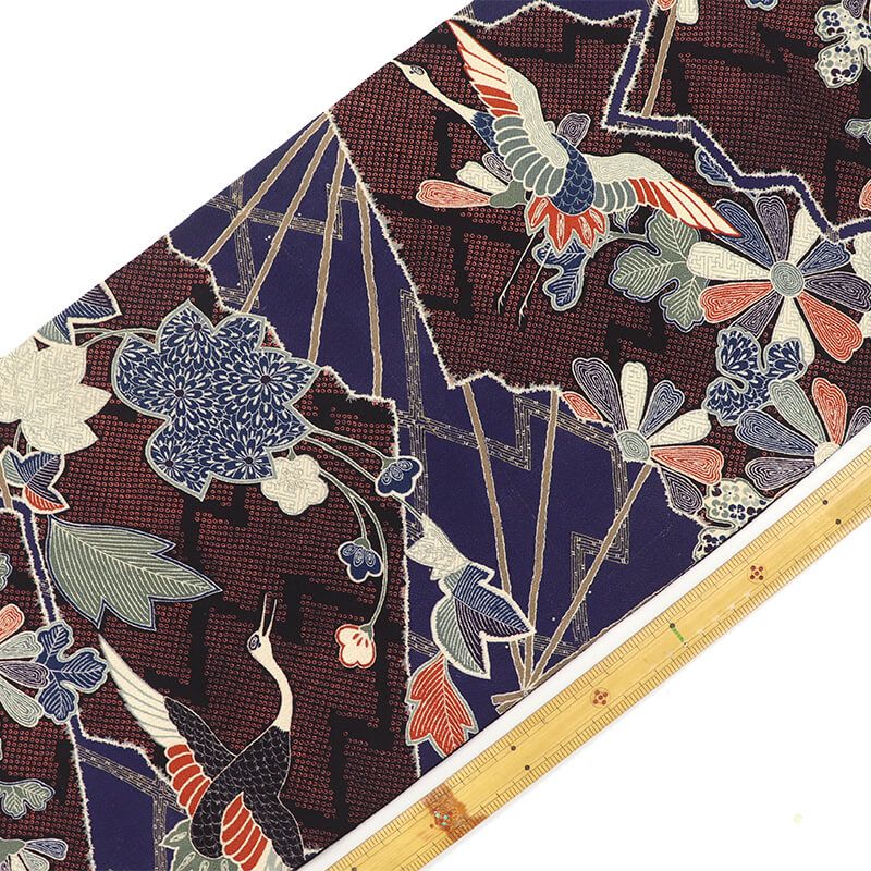 アンティークの雰囲気が漂う縮緬の名古屋帯です。深みのあるネイビーや、鹿の子柄の地に、 鶴や松皮菱などの柄が表現されております。 デザイン化された和の柄が素敵な帯です。
