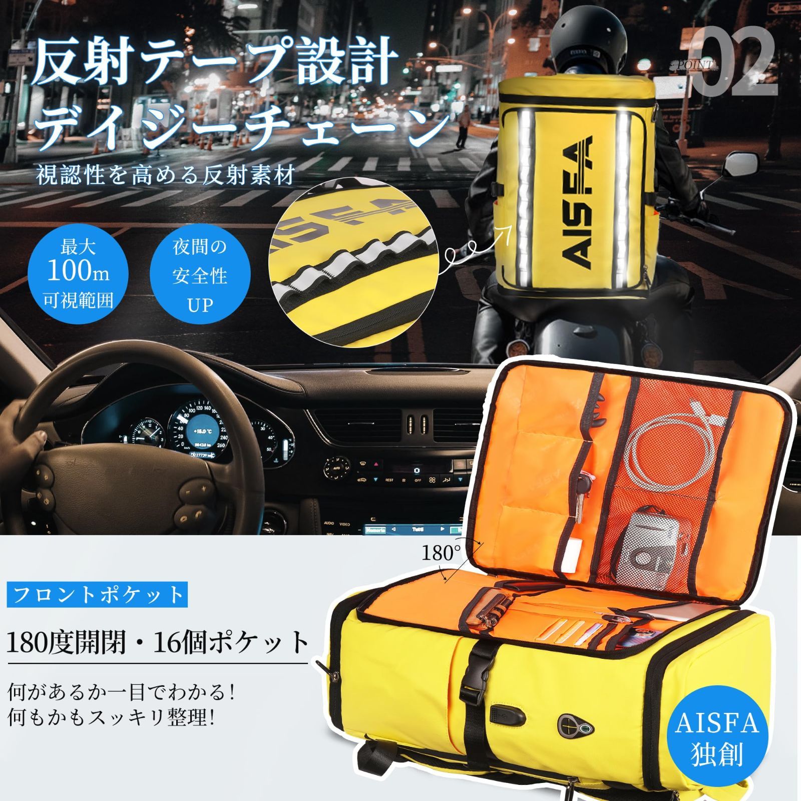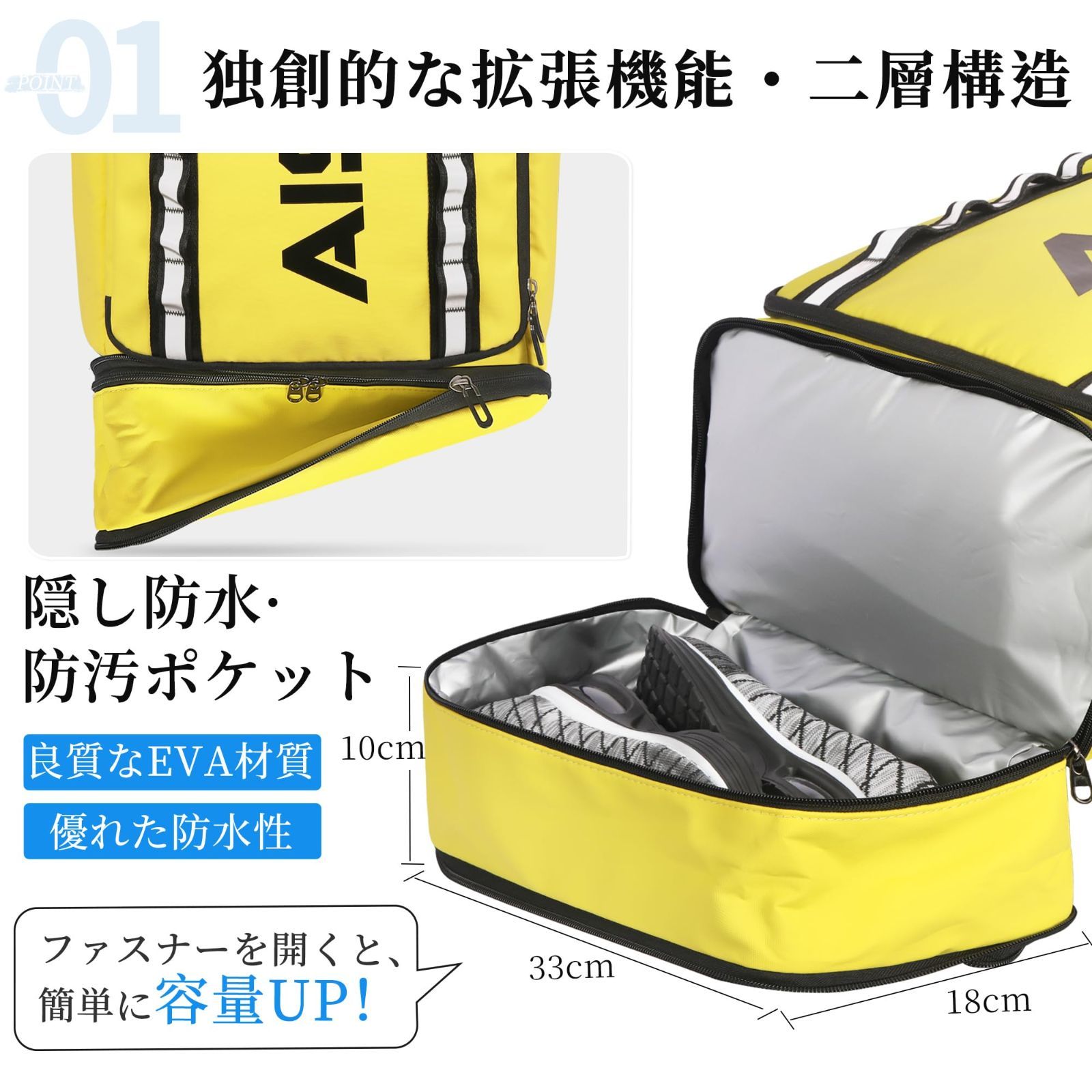 【上下二層構造】AISFA独創のコンパクトな設計の究極的な隠れたウェット&ドライ両用ボトムコンパートメントです。収納スペースが上下に分かれた2層式タイプです。下層ポケットは防水シート仕様なので、靴やお弁当、濡れた傘、服などを分けて収納できます!特に梅雨に最も効果的!