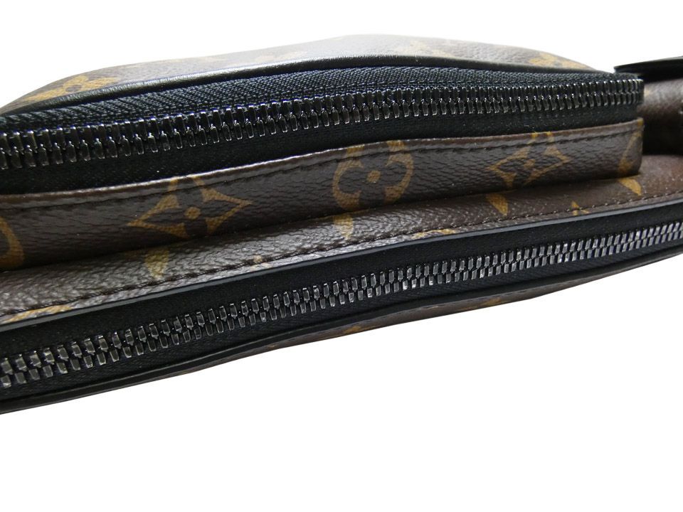 前面に二つのポケットを持ったボディバッグ。モノグラムにブラックレザー、ブラック金具がかっこいいモノグラムマカサー。ICチップ。