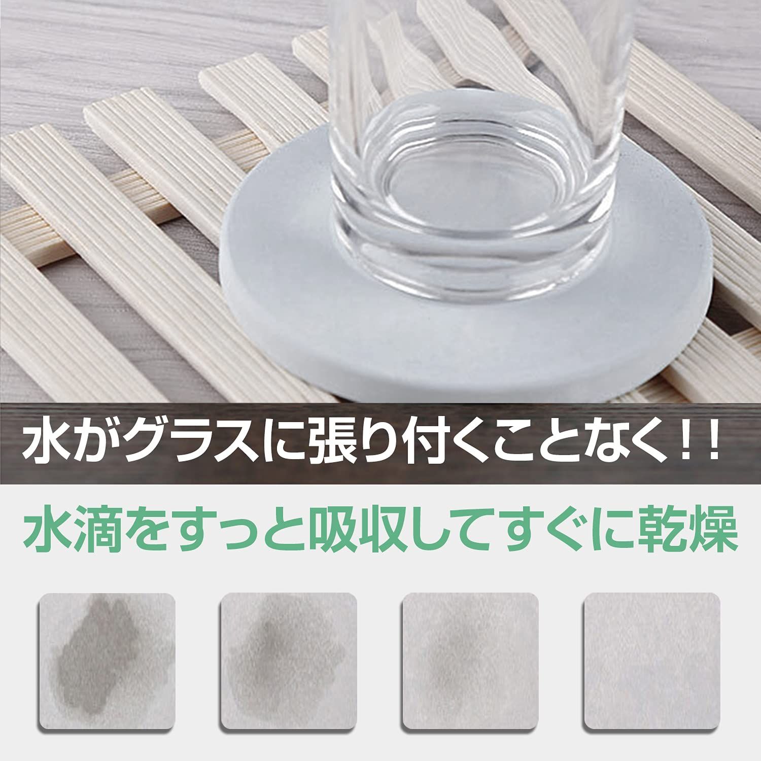 速乾性・吸水性抜群:グラスに冷たい飲み物を入れたときにできる表面の水滴を、珪藻土の持つ優れた吸水性で、すばやく吸い取ってくれます。珪藻土コースターはテーブルを濡らさず、グラスを持ち上げた時の水で衣類や書類を濡らすこともありません。