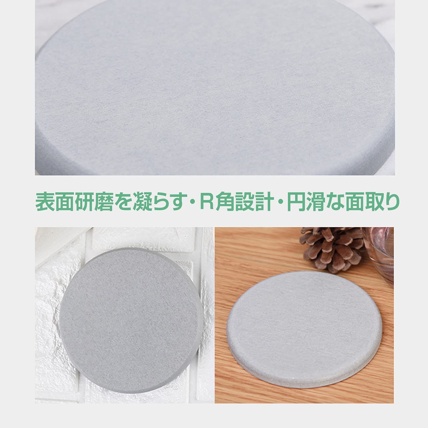 滑り止め・快適な肌触:珪藻土コースターの表面はざらざらしておりコップの裏の水分を効果的に吸収しながら滑りにくくなっているので、滑り止めマットは要らない、コルクマットの磨損しやすさの悩みもありません。しかも珪藻土のナチュラルな質感で滑り止めの機能があって、テーブルの摩耗や傷を防ぐことができます。ドリンクコースターのエッジは人間化の設計を採用して、スムーズに処理されて心地良い手触りを増加しました。