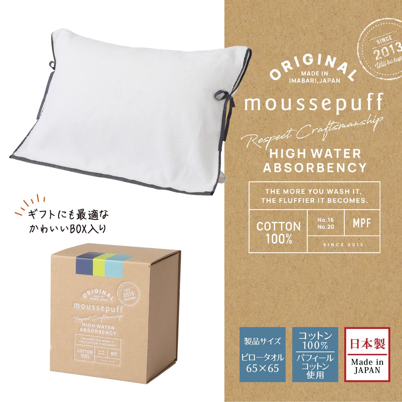 nishikawa 【 西川 】ムースパフ ピロータオル 枕カバー パイル地 65X65cm 洗える 綿100% 洗うたびふっくら 独自のパフィールコットンで しっかり吸水 ふんわりやわらか 日本製 今治製 今治タオル ホワイト TT93303010
