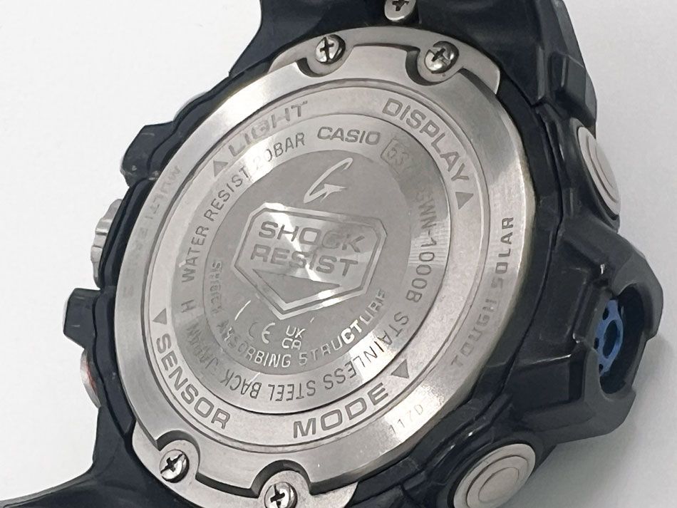 商品説明:耐衝撃構造(ショックレジスト)無機ガラス ネオブライト 20気圧防水 タフソーラー(ソーラー充電システム)電波受信機能 方位計測機能 気圧計測機能 高度計測機能 温度計測機能 針位置自動補正機能 針退避機能 ワールドタイムなど