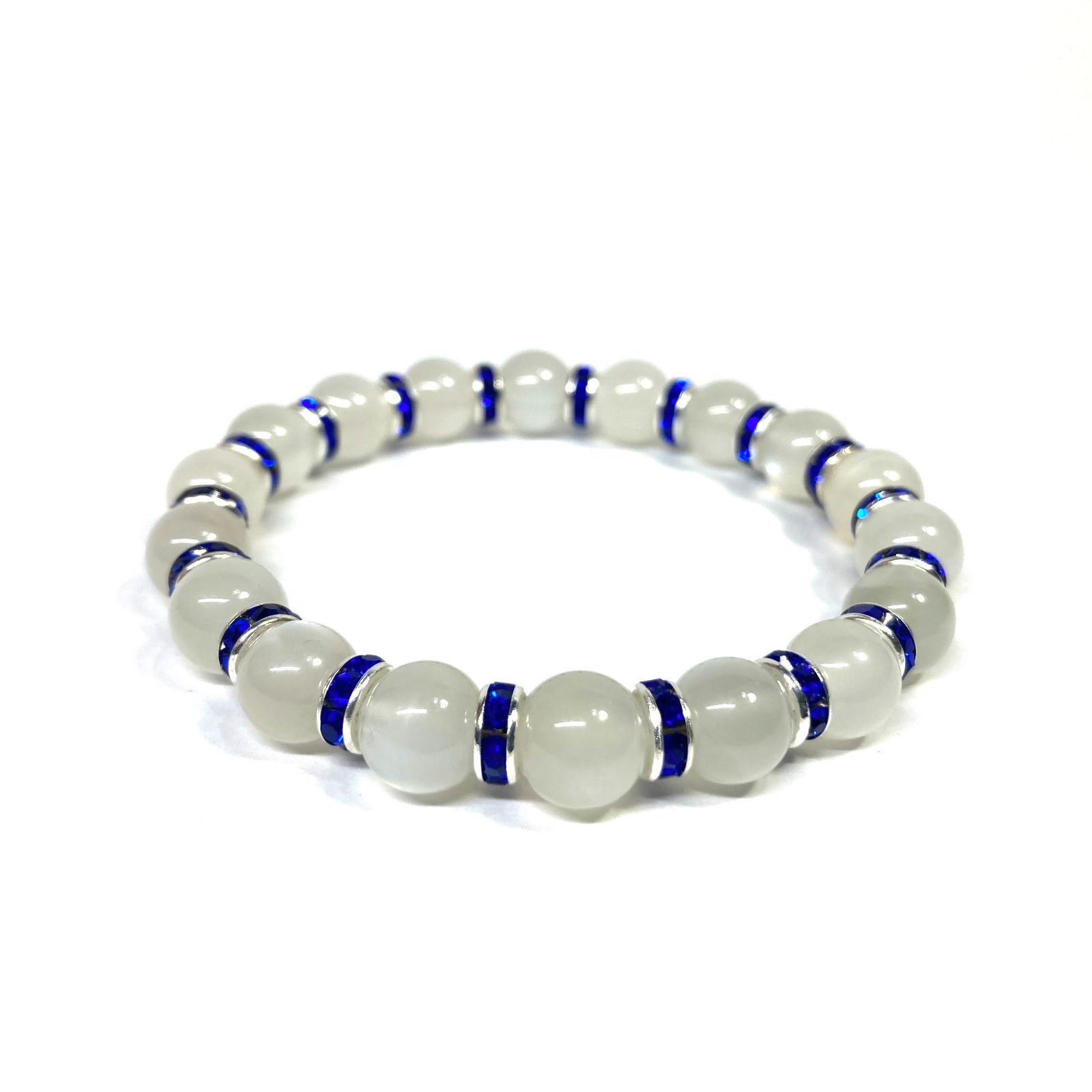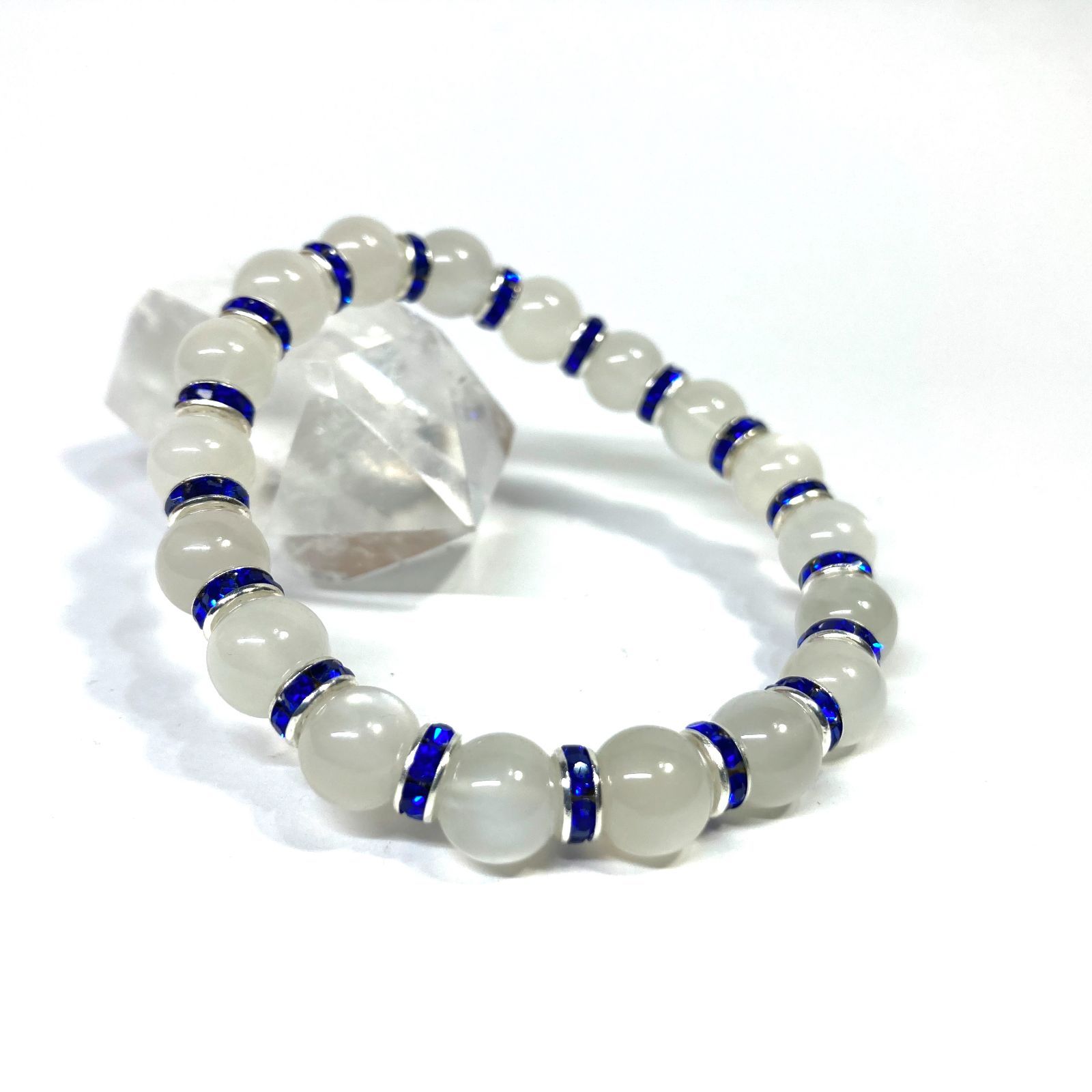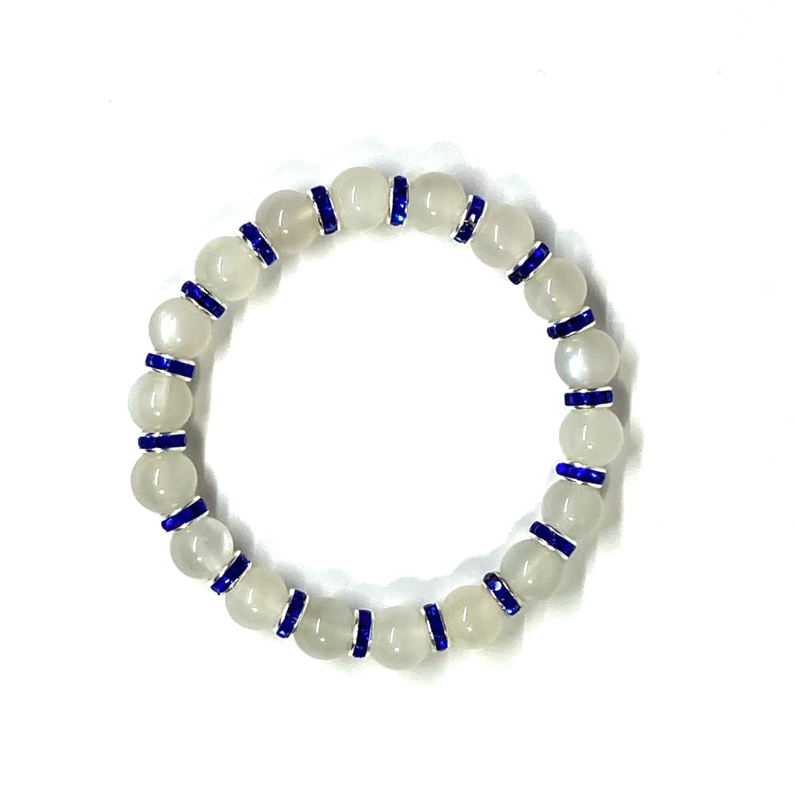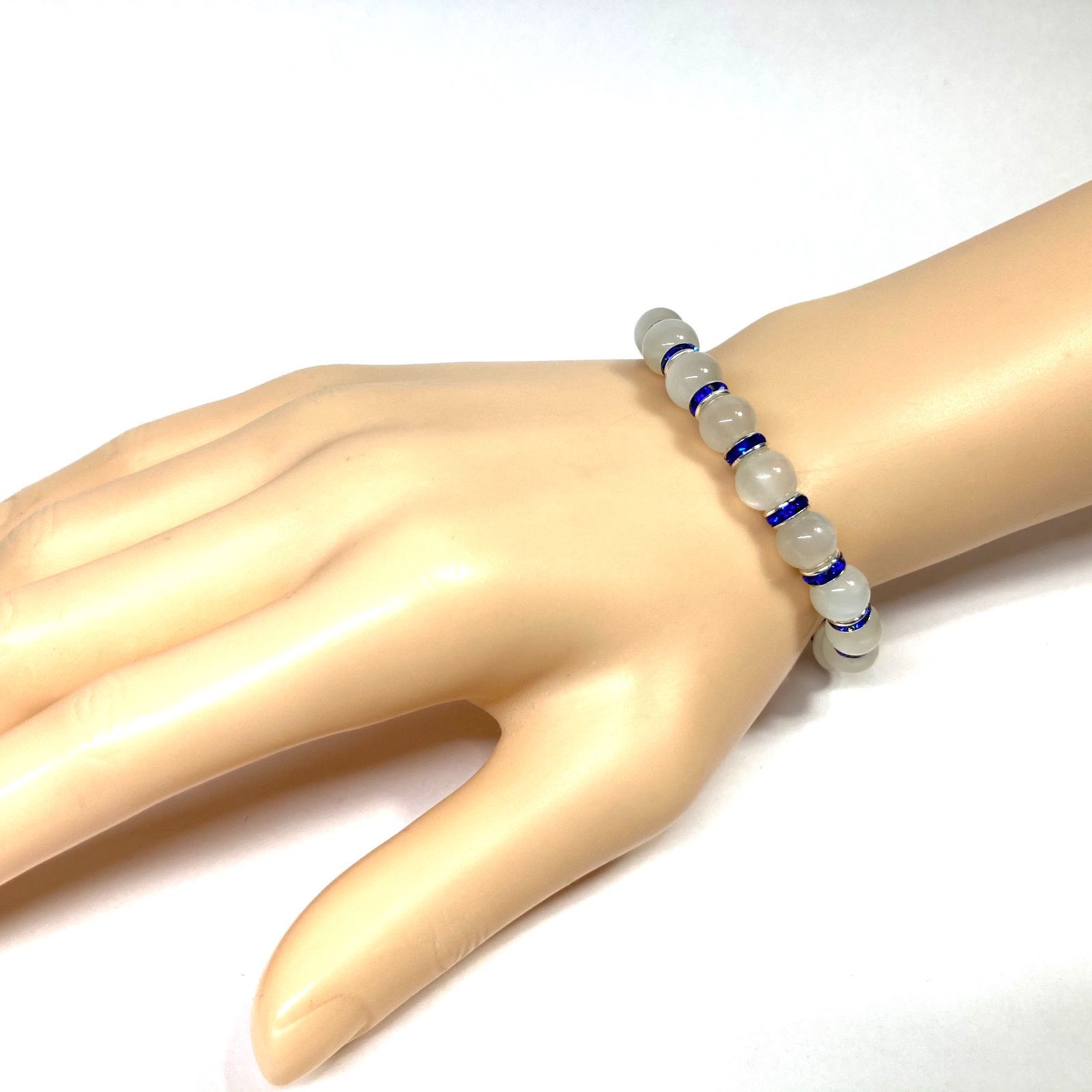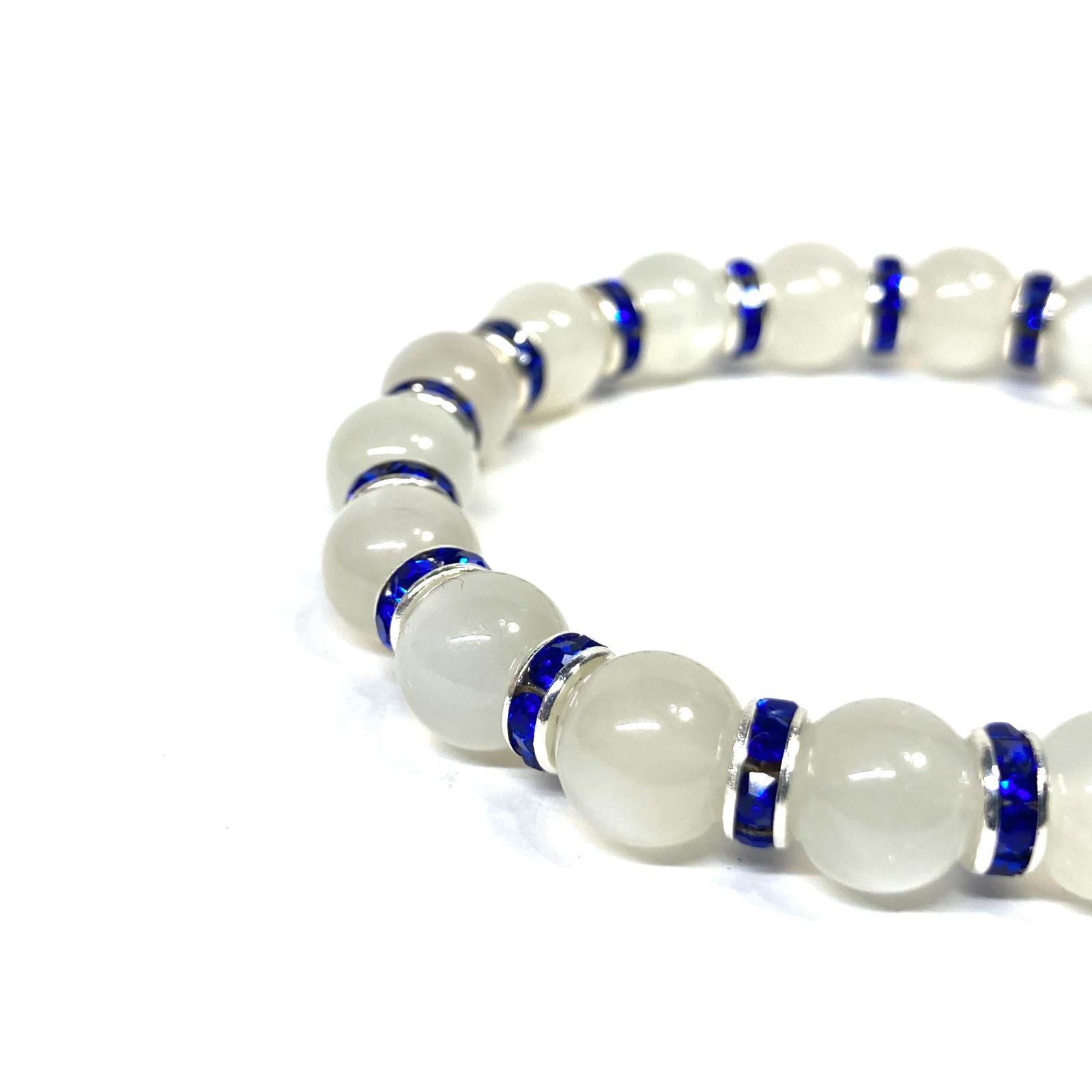 こちらは、ムーンストーンの8mm玉を使用したパワーストーンブレスレットです。石との間にはロンデルを挟み高級感を演出しております。シンプルなデザインは、シーン問わずどんなコーディネートとも合わせ易いブレスレットです。サイズは内周約15cm (手首周りを測り少し余裕をもってお買い求めくださいませ。)です。当社の中でも一番人気の実績があるデザインとなっております。気になる方はお早めにどうぞ。