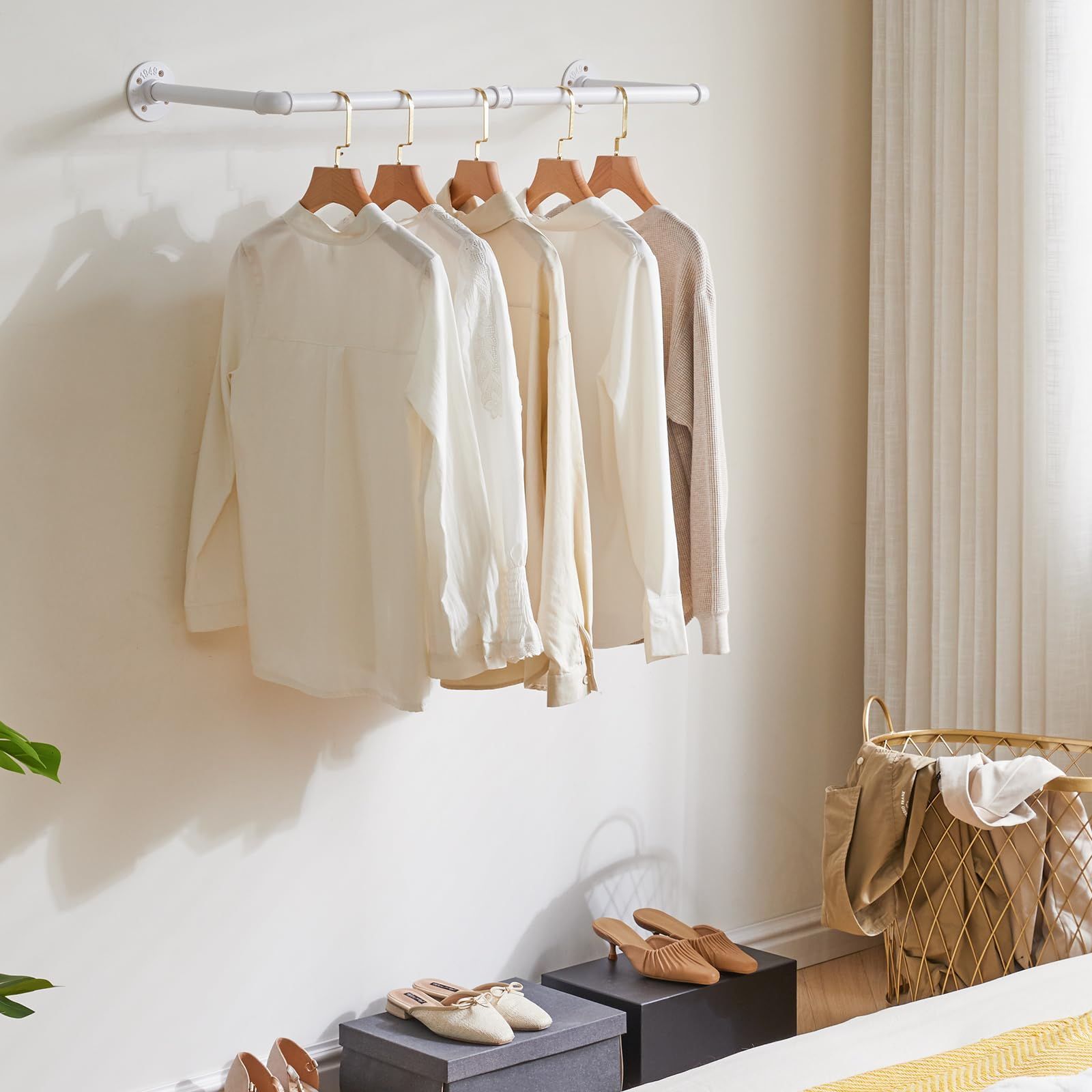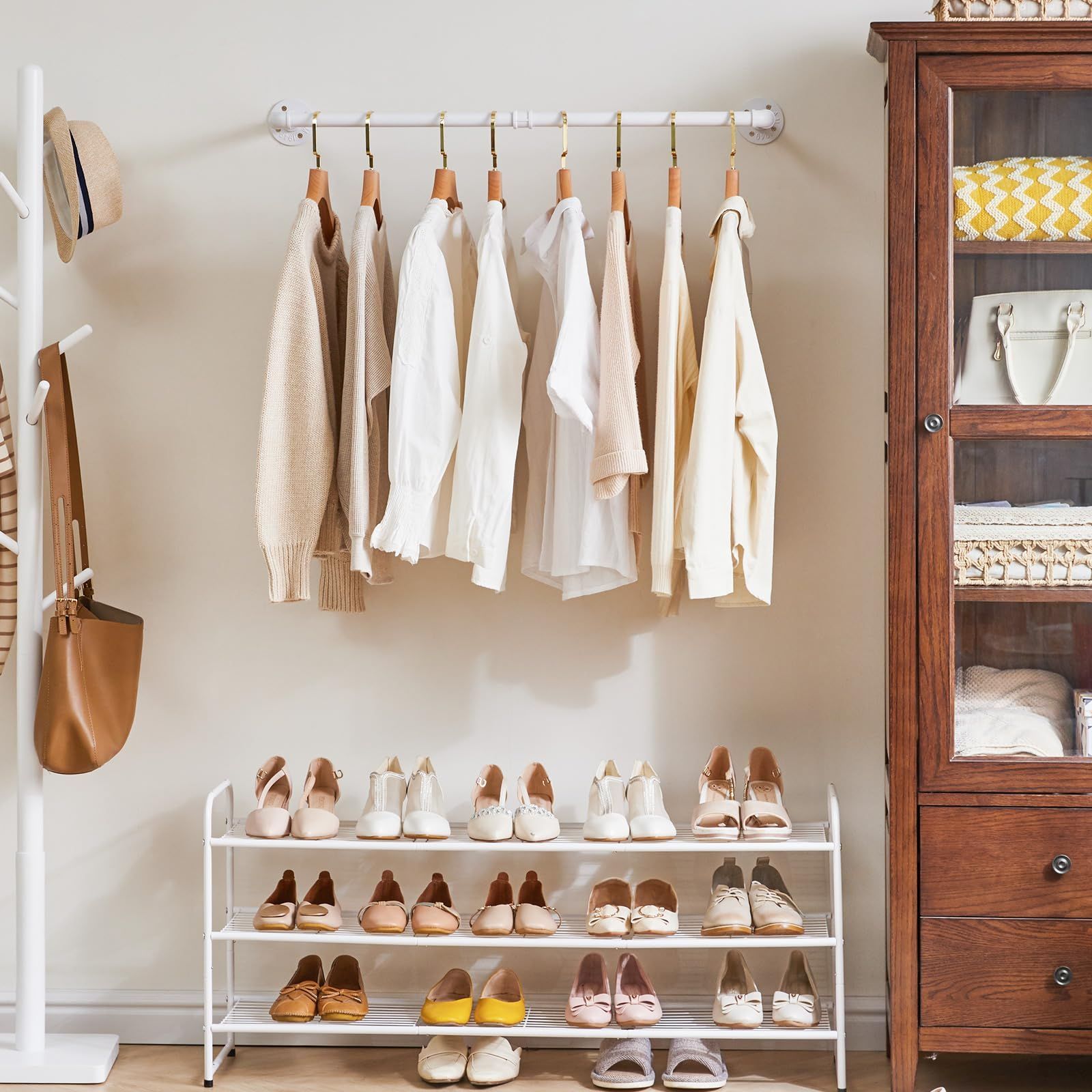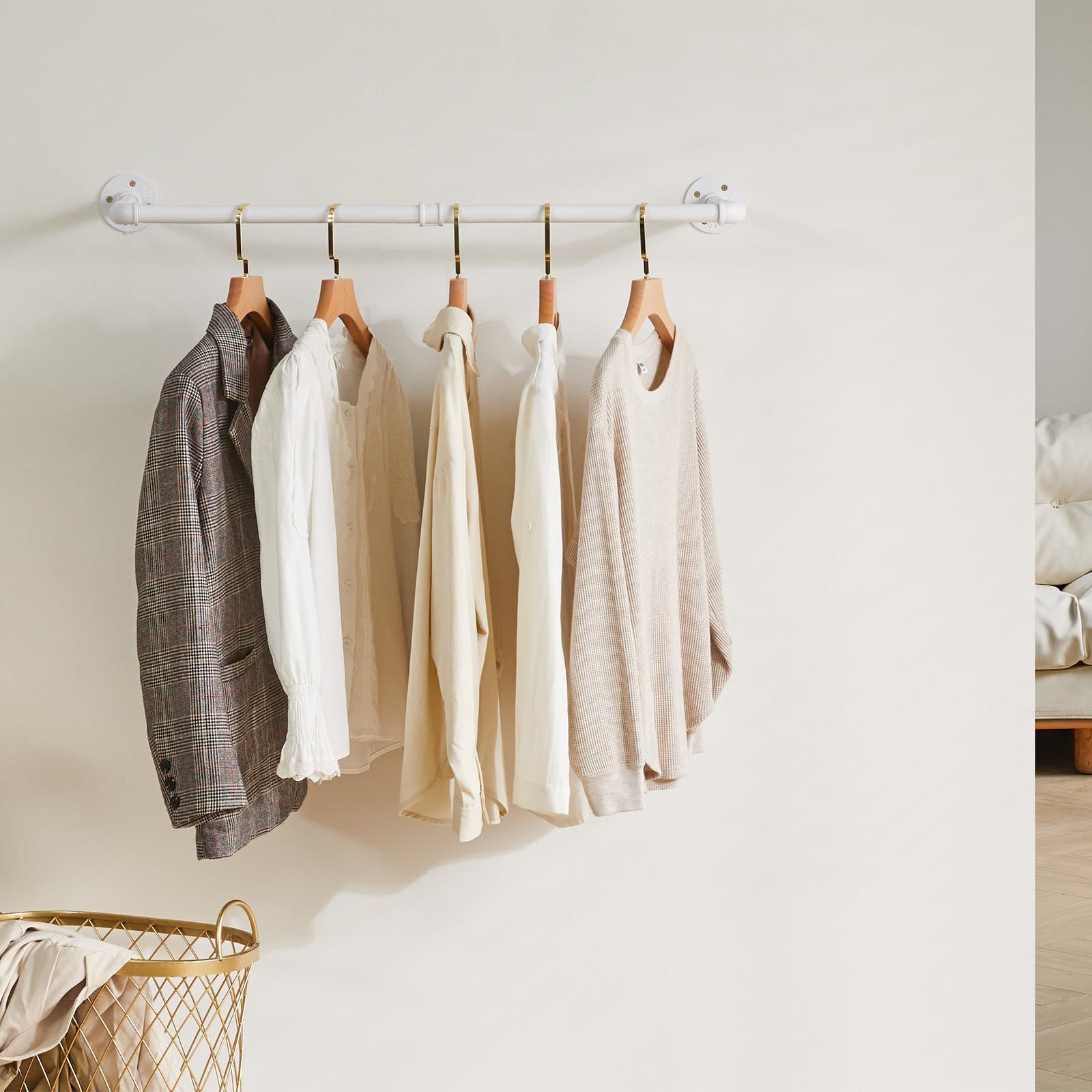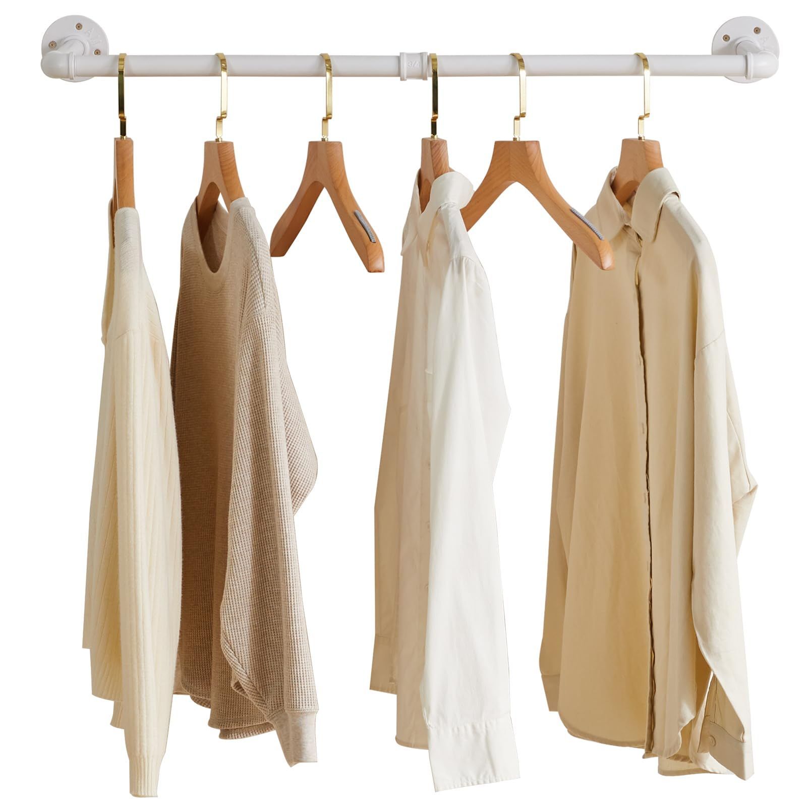 たっぷり収納:半艶の白パイプは丈夫な中空のスチールで作られ、十分な強度を持ち、耐久性に優れています。なので、洋服やコートなどを沢山掛けてもしっかりしています。