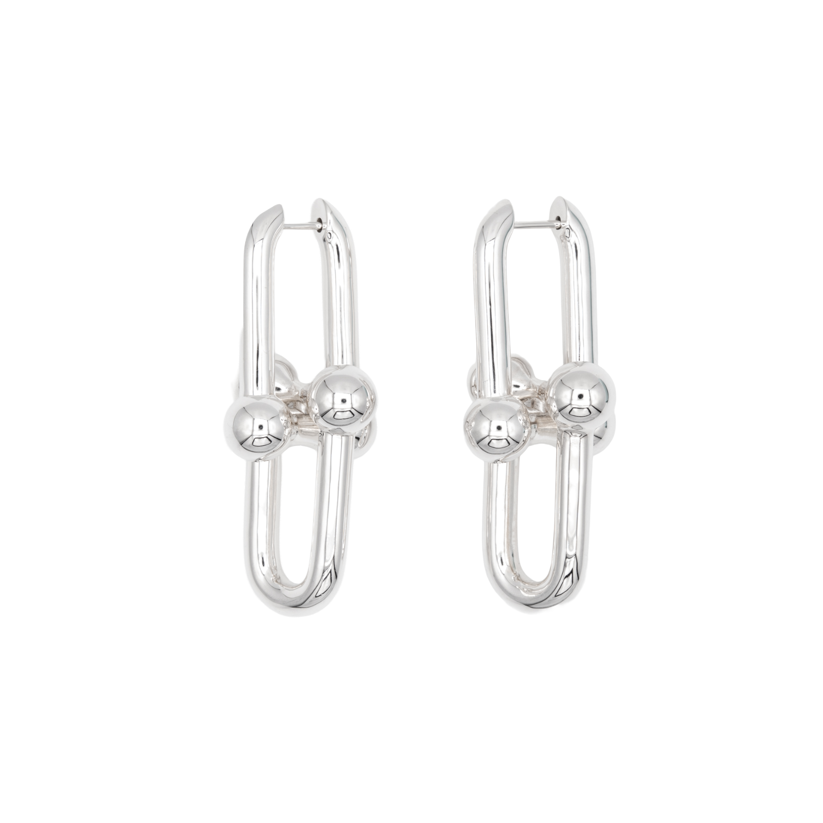 立体的なリンクが耳元に力強いラインを描き、インダストリアルでありながら洗練された印象を与えます。