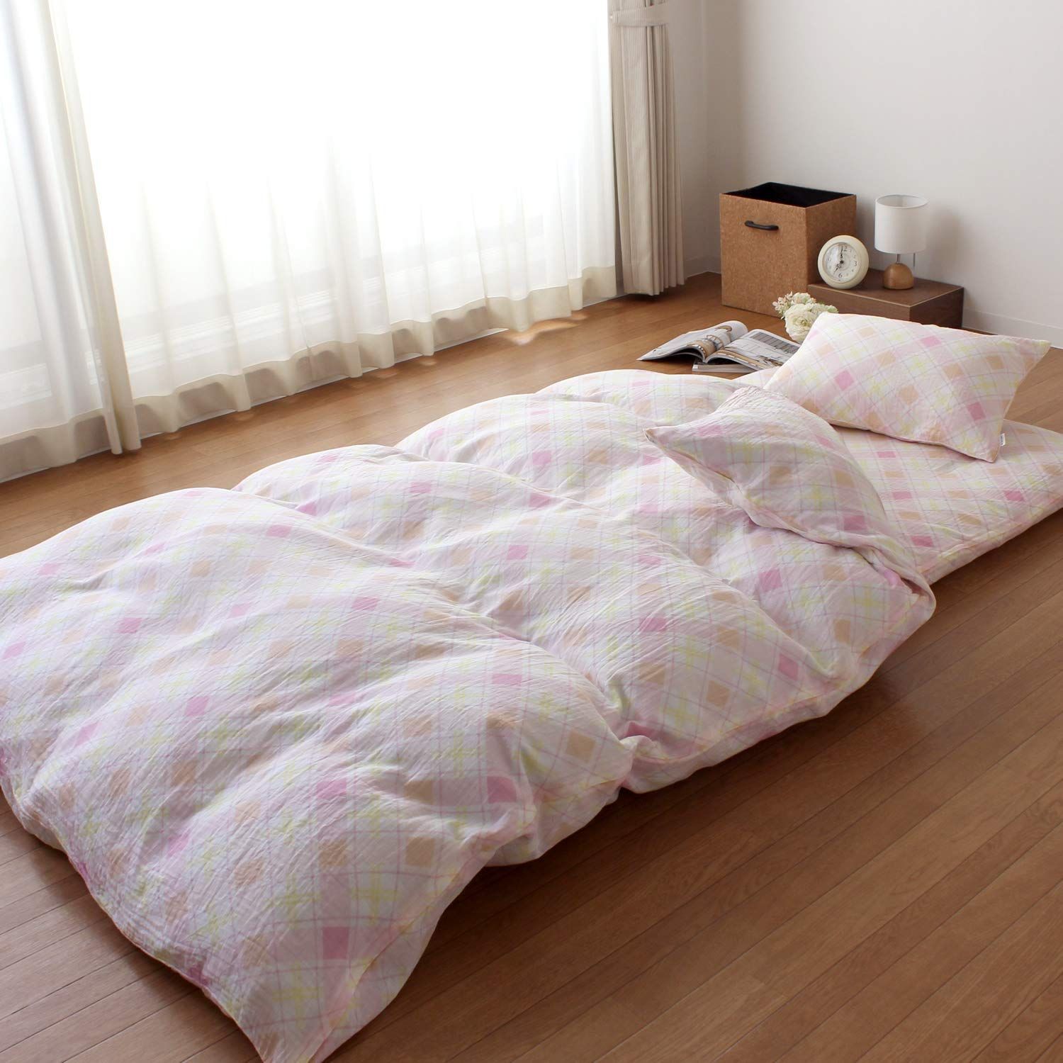 スウィートなチェック柄。淡いパステルトーンでまとめた明るい印象のカバー。両面プリント柄で裏表なく使用できます。
