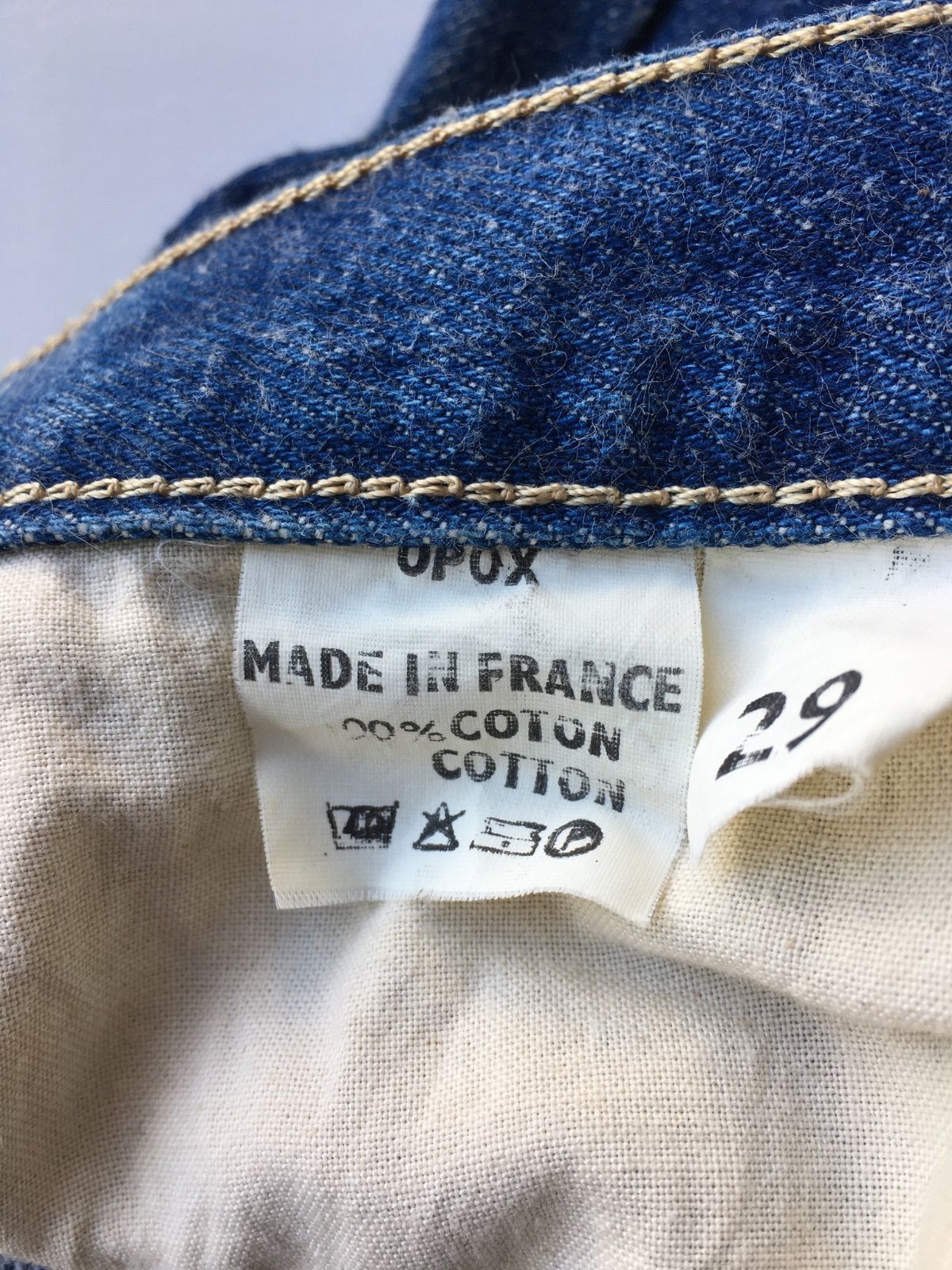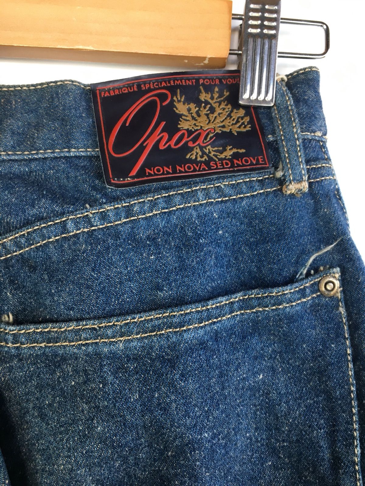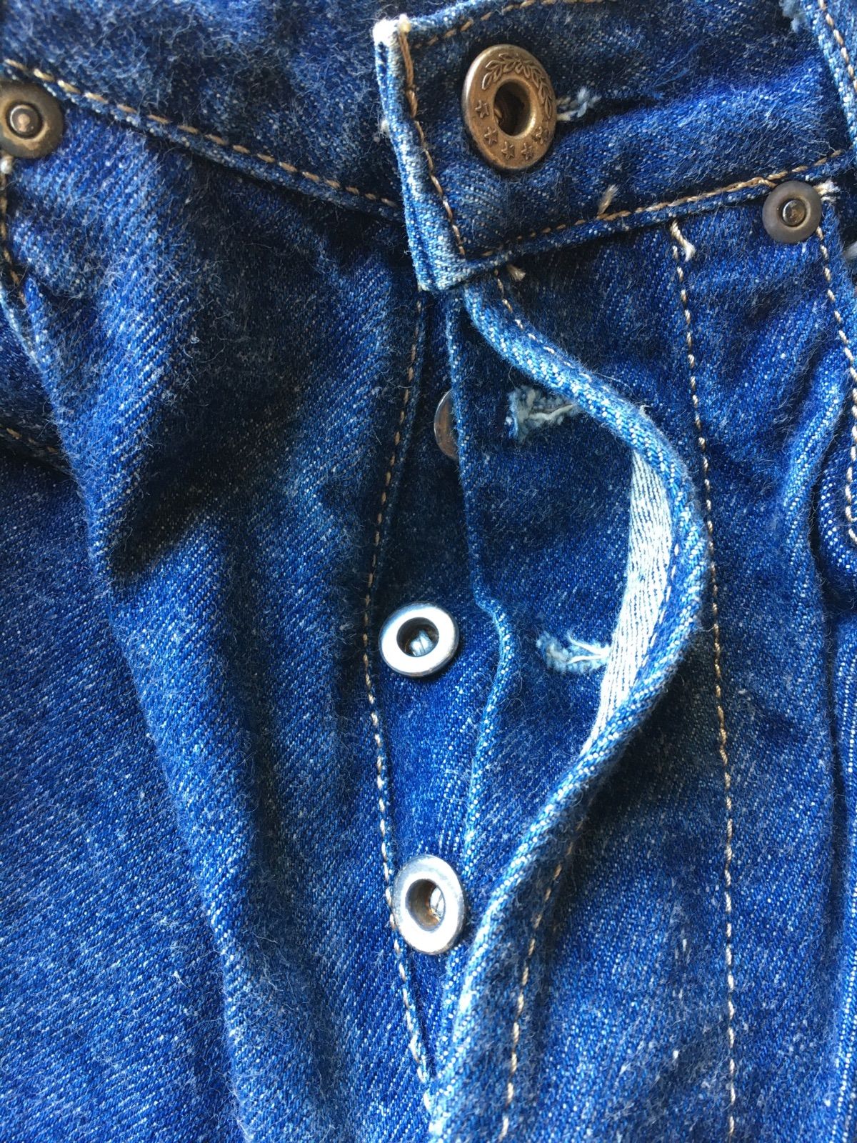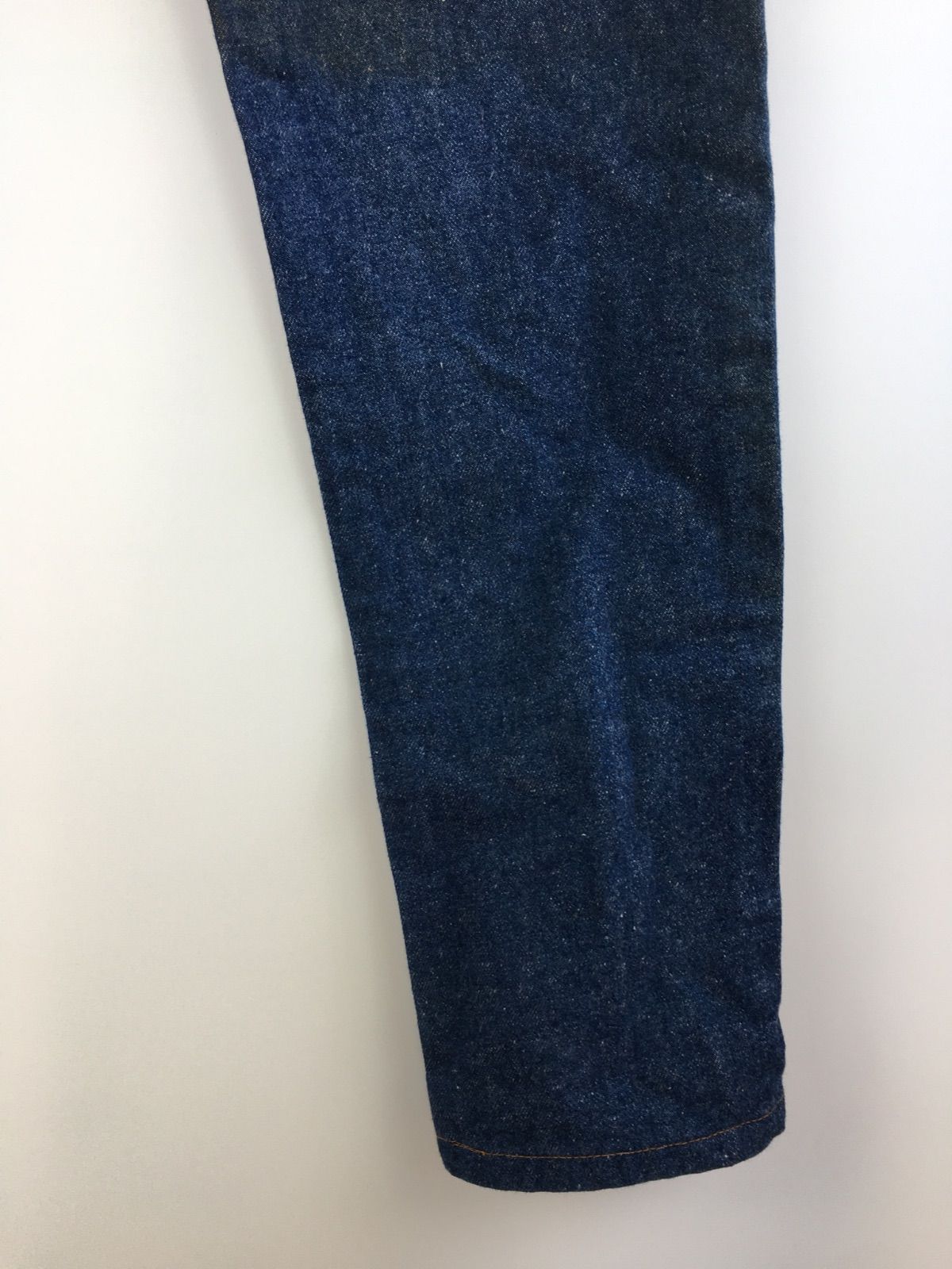 オーソドックスな5ポケット仕様のブルーデニムです。深みのあるインディゴカラーを残しつつ、膝周りや太ももに程よくアタリが出始めた、育て甲斐のある一着です。