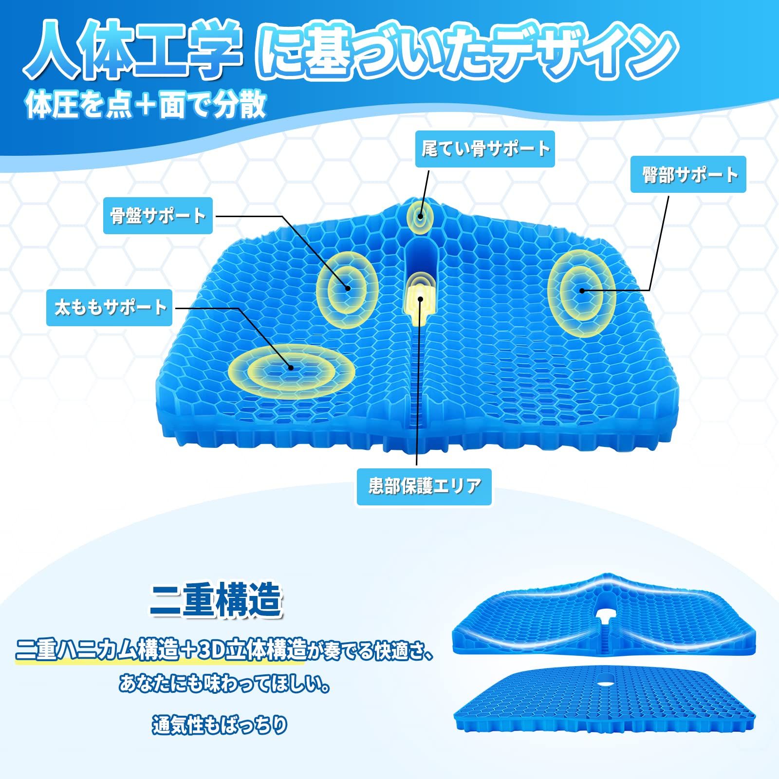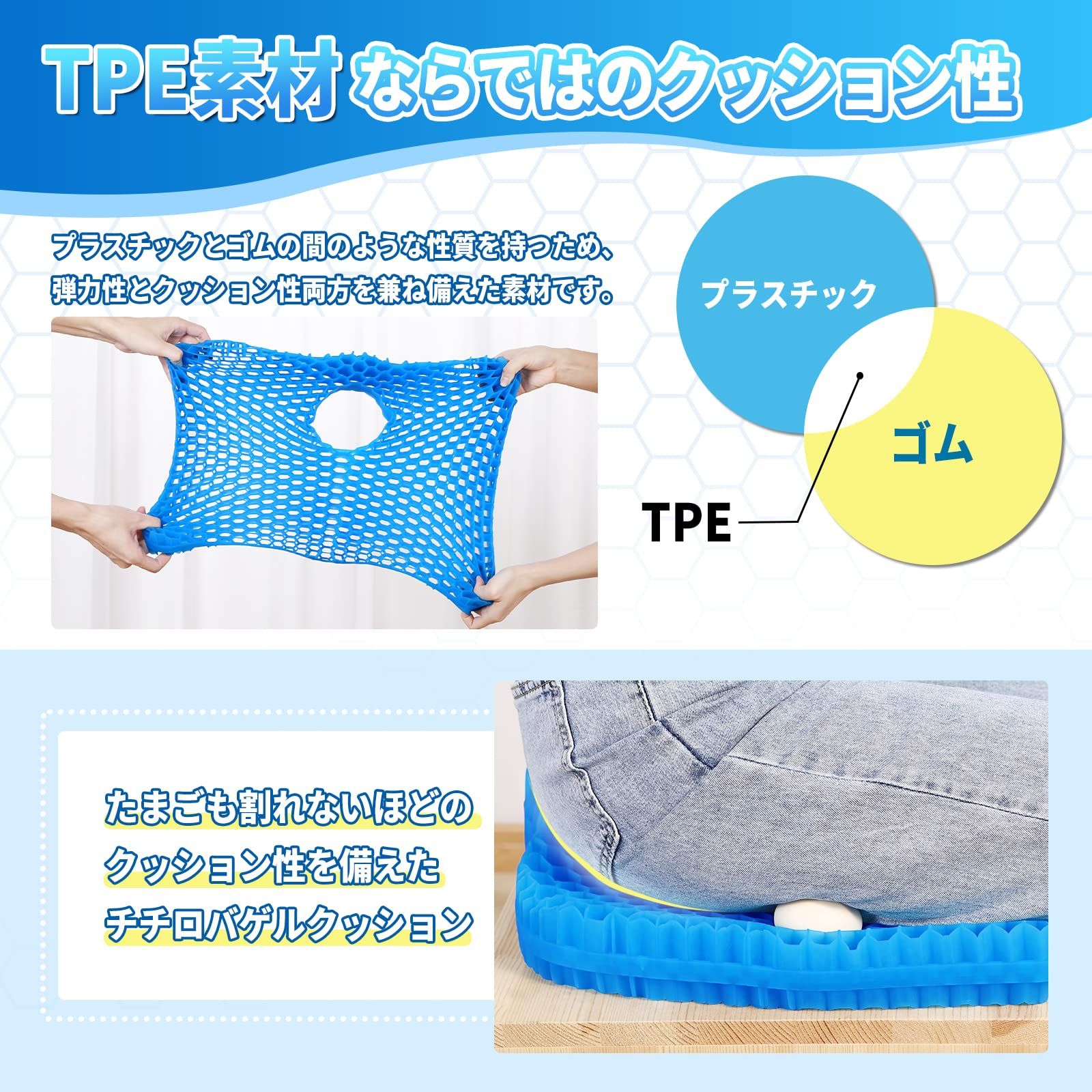 【二重ハニカム構造・蒸れにくい】クッションにはハチの巣のような穴が空いており、なおかつTPE素材をしているため、通気性はぐっどです。柔らかすぎず硬すぎず、冷えず蒸れず、快適にお使いいただけます。