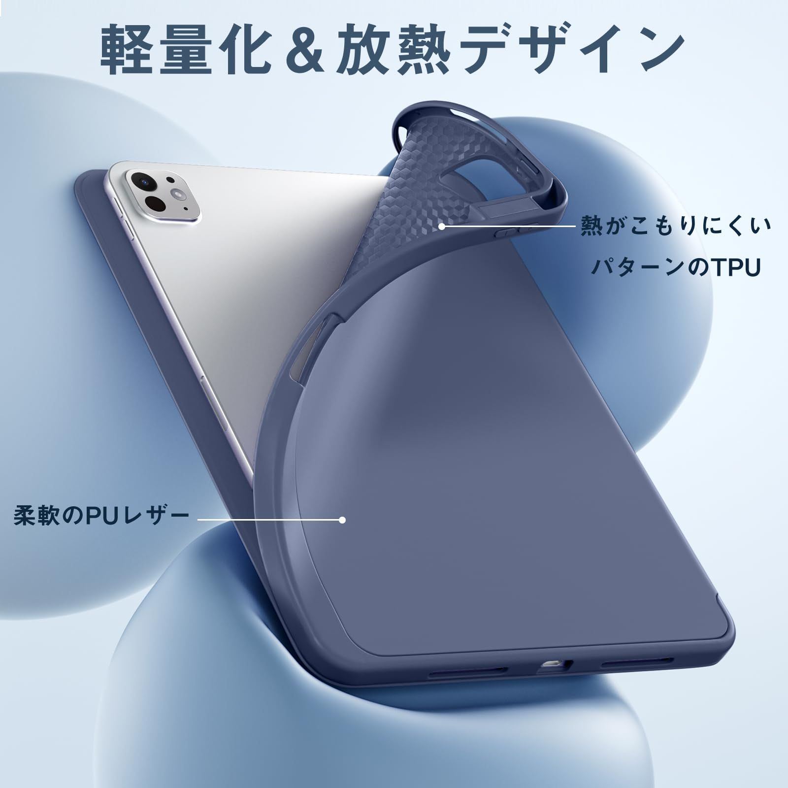 【全面保護・放熱デザイン】 ケースの前蓋は柔軟で耐衝撃性高い合成PU素材を採用され、端末にしっかりフィットして対応iPad Proを保護するだけでなく、滑らかな手触りを提供する。背面TPU素材なので、軽量、超薄を備えて取り出しも簡単、本体をキズ付かない。同時にケース内部は端末の放熱のためのエアーを逃す溝の空間を作るで本体に熱がこもるのを防ぐよう設計をする