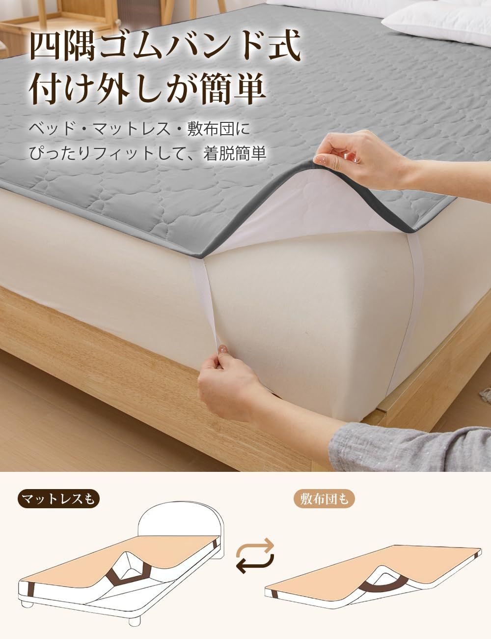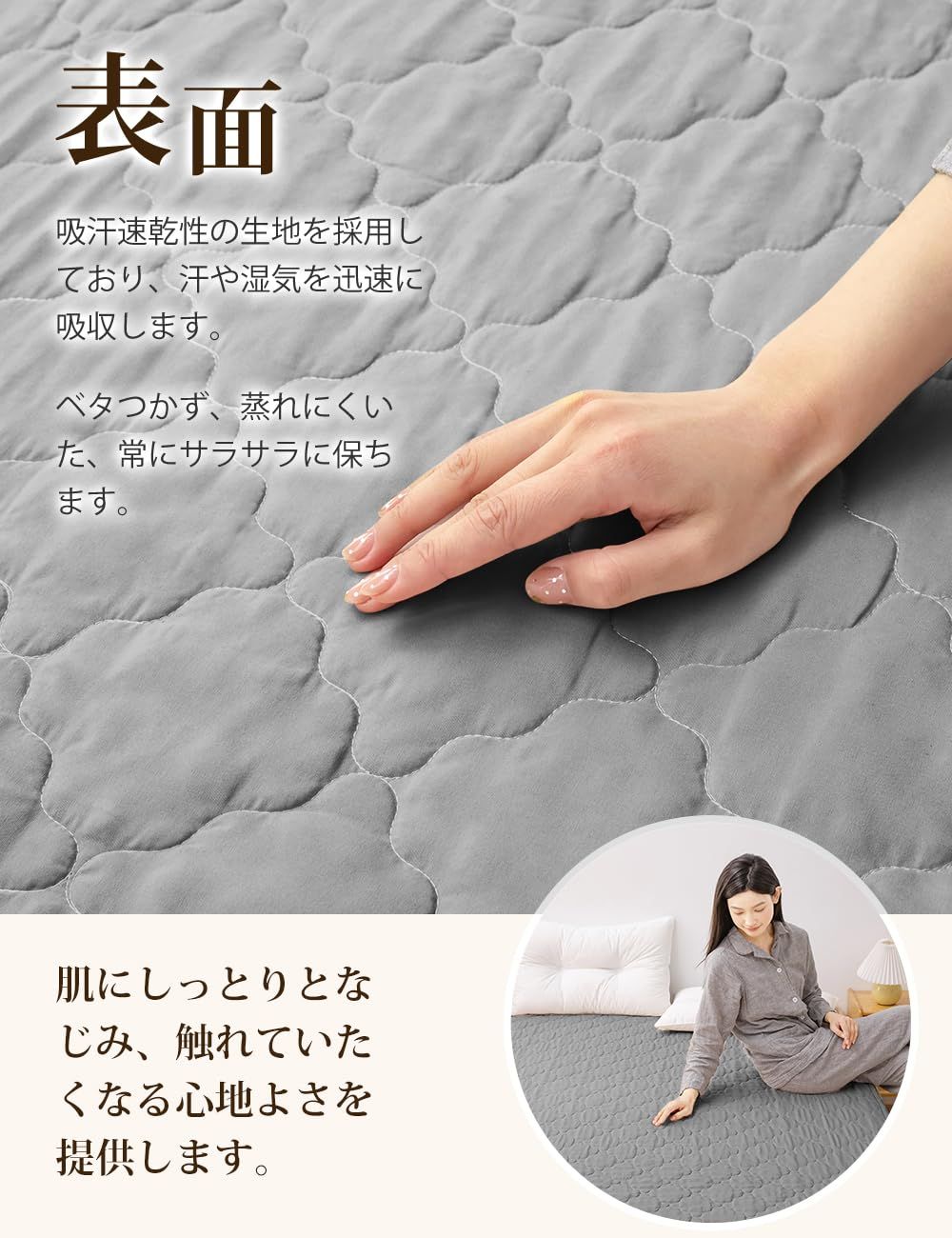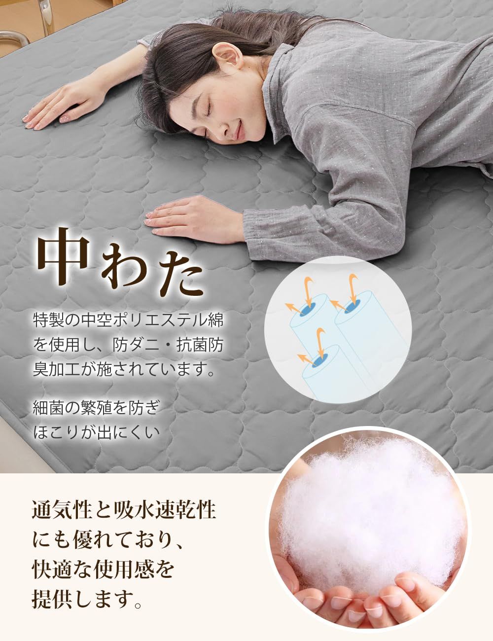 ??丁寧キルティング加工??柔らかい再生繊維を使用し、丁寧なキルティング加工で仕上げられた敷きパッドは、ふんわりとした快適な寝心地を提供します。