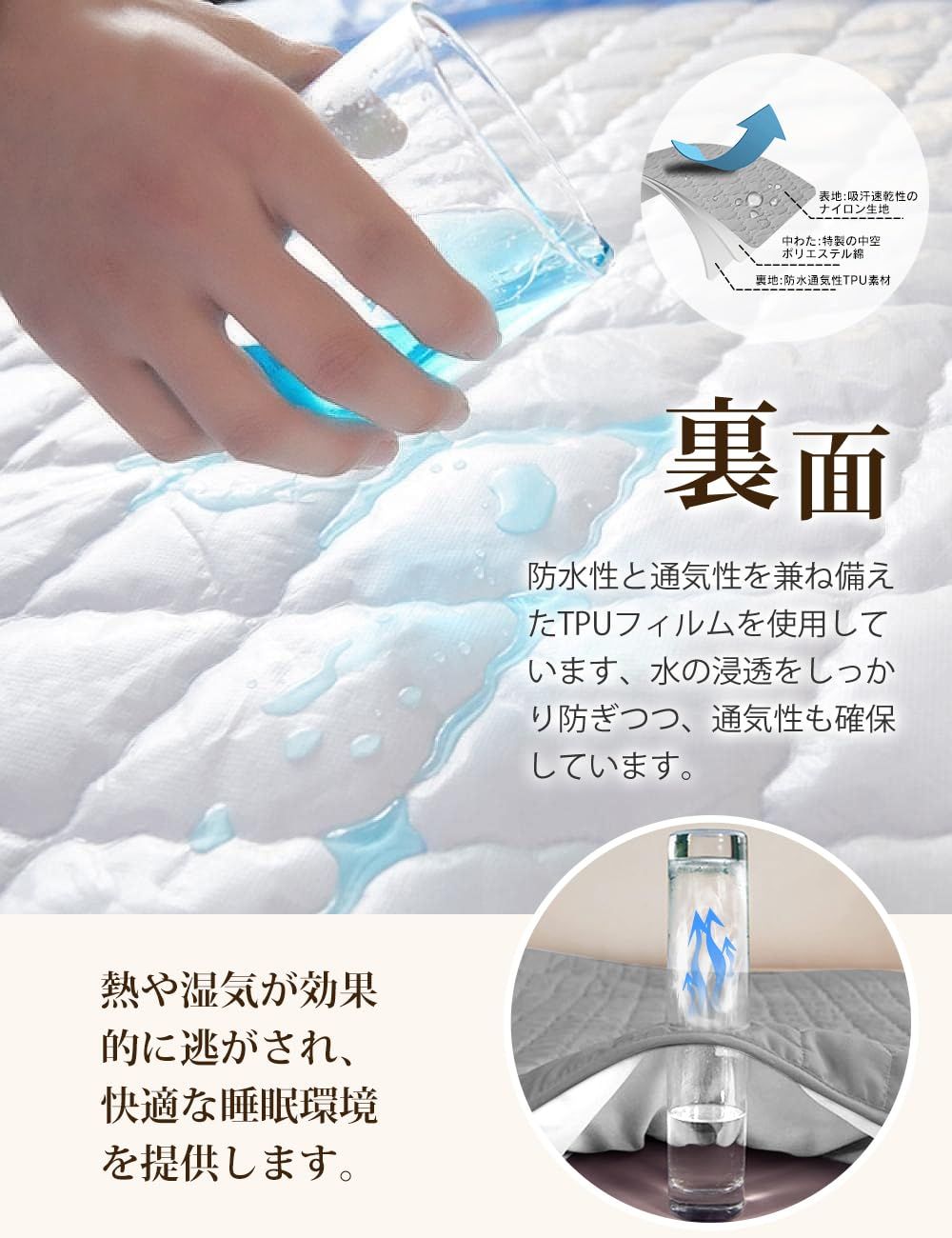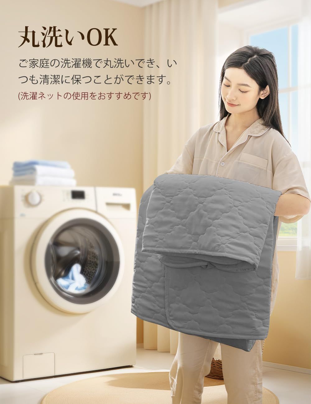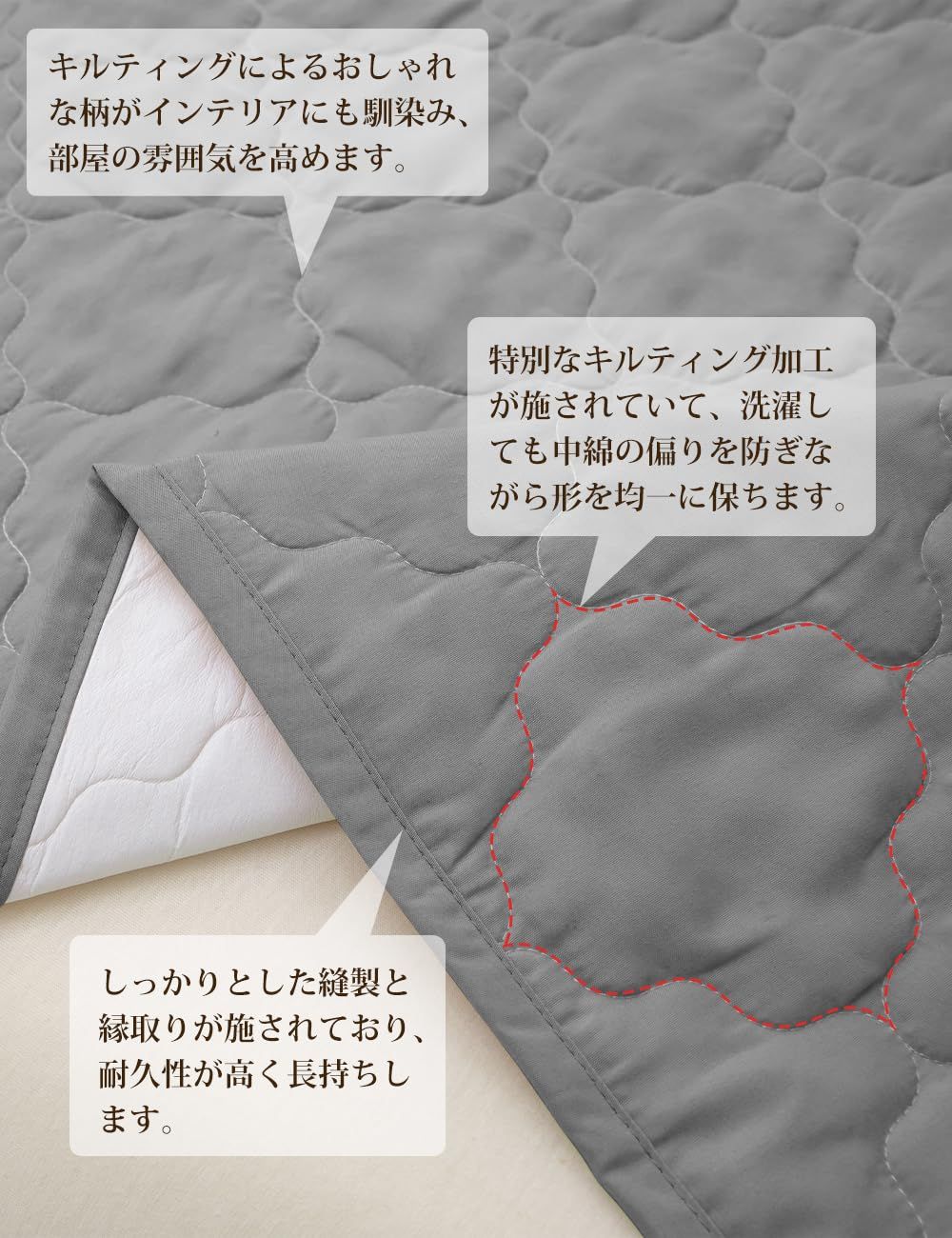 ??丁寧キルティング加工??柔らかい再生繊維を使用し、丁寧なキルティング加工で仕上げられた敷きパッドは、ふんわりとした快適な寝心地を提供します。