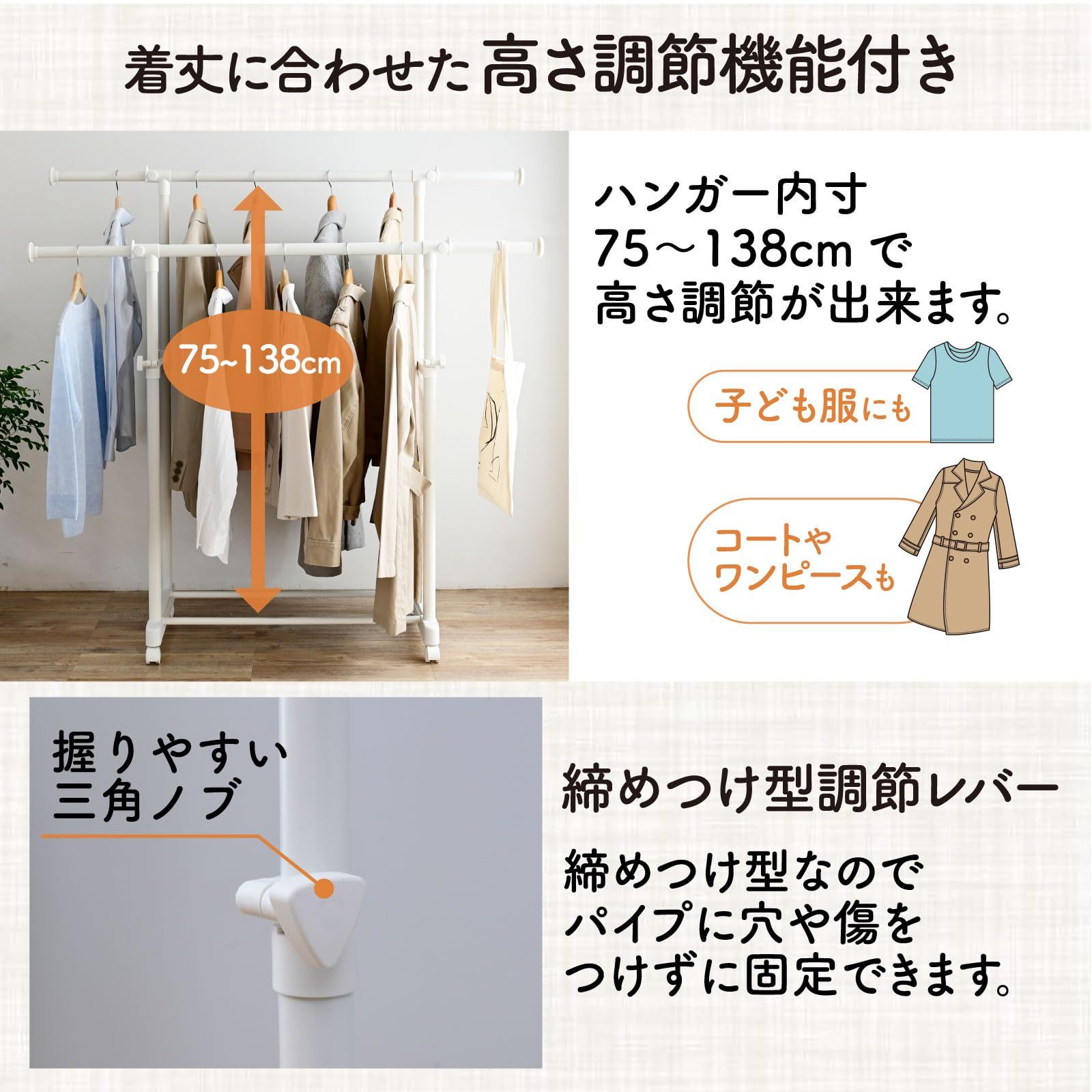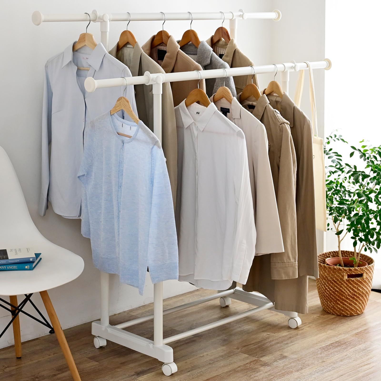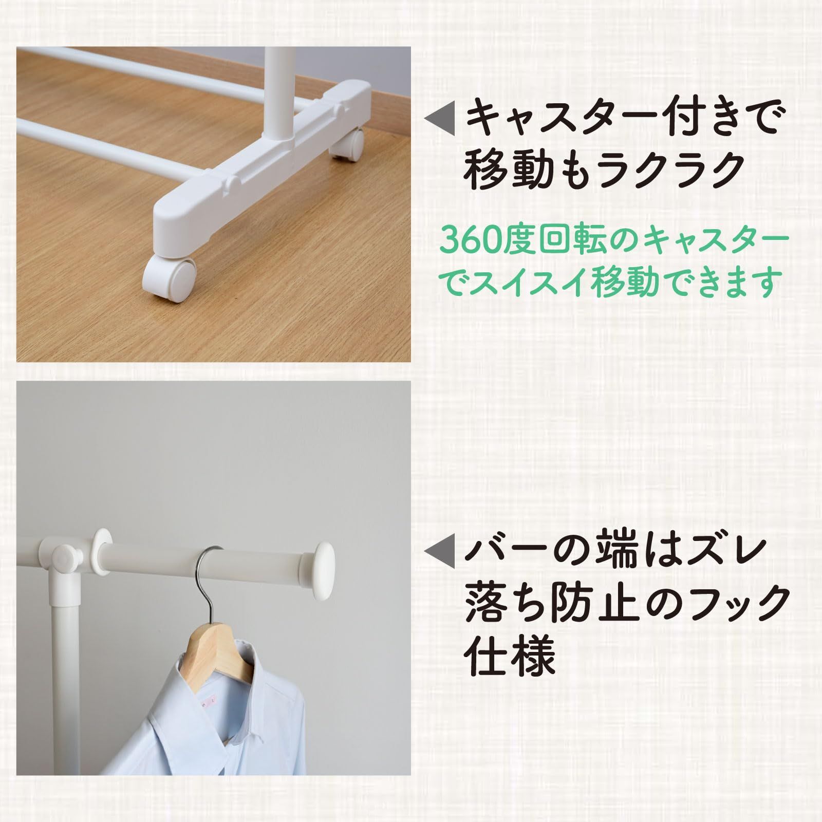 【シンプルだからあらゆる場面で活躍】一人暮らしの衣類収納や、玄関のコートハンガーとしてなど、幅広くお使いいただけます。キャスター付きなので掃除や場所移動もラクにできます。前後にバーのあるダブルタイプなので、よく使う物は手前に、季節外のものは奥に、などの使い方もできます。シングルと同じサイズながら2倍の収納力が魅力です。