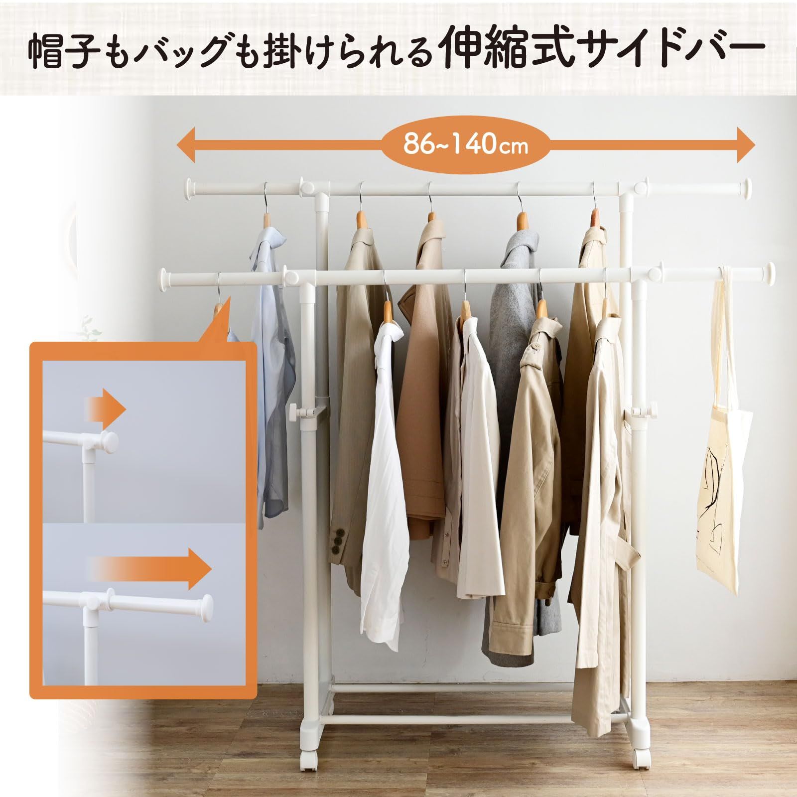 【縦/横伸縮でたっぷり収納】サイドバーが伸びるので、さっと取れるよう毎日使うコートを掛けたり、ネクタイやストール、帽子などの衣類小物の収納にぴったりです※サイドバーの耐荷重:1kg