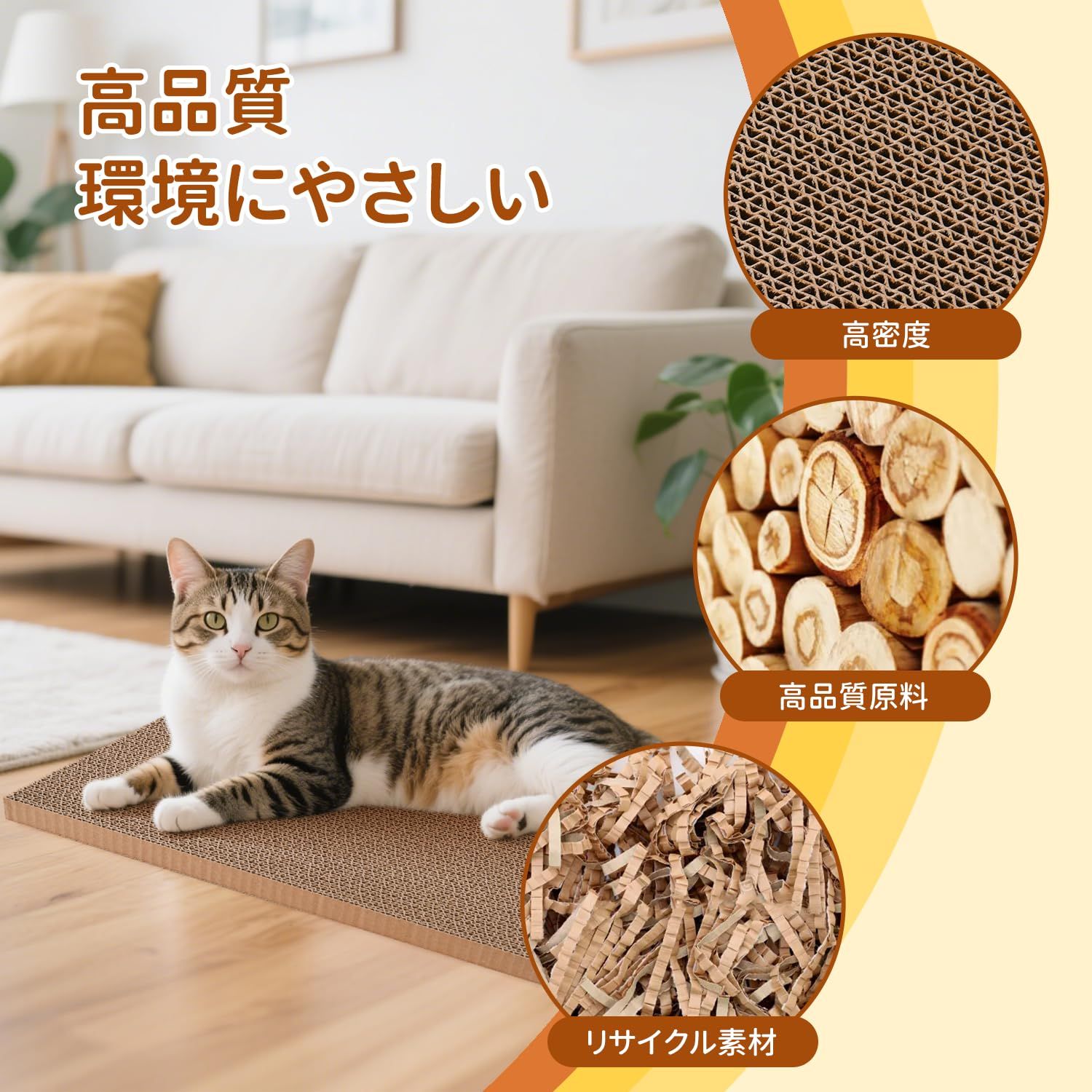 【こだわりの素材】こだわりの100%原紙を使い、安全で環境にやさしい。大切な猫に安心して使えていただけます。厚さ2cmの爪とぎが裏返して使用でき、また通常の段ボールの倍の強度を誇る高密度強化した段ボールを使用しているので一般的な爪とぎより長持ちです。