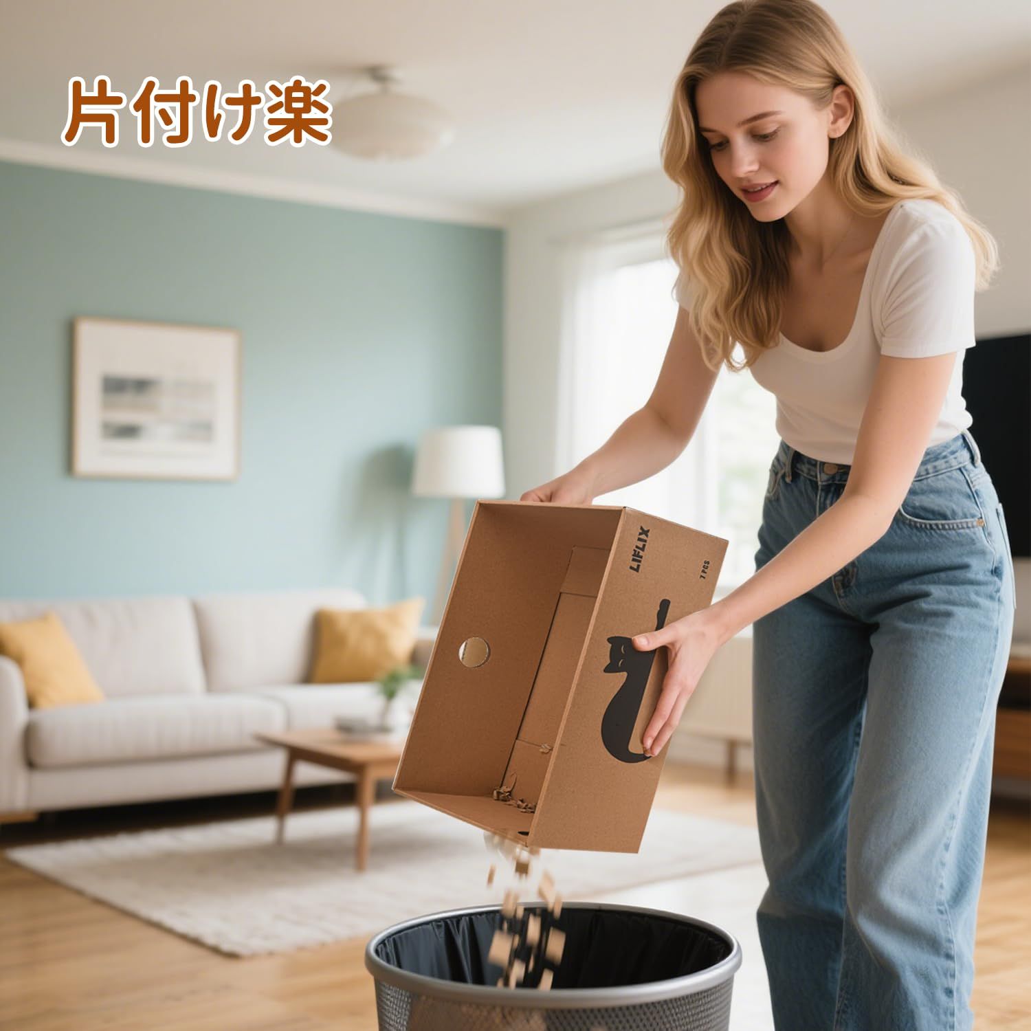 【商品情報】本体サイズ:42×32×15cm(幅X奥行X高さ) 数量:箱x1;爪とぎサイズ:41×31×2cm(幅X奥行X高さ) 数量:爪研ぎx7;またたび 仕様:箱型 。側面には取り出しに便利な穴があり、黒猫をイメージしたシンプルデザインで部屋になじみやすいです。