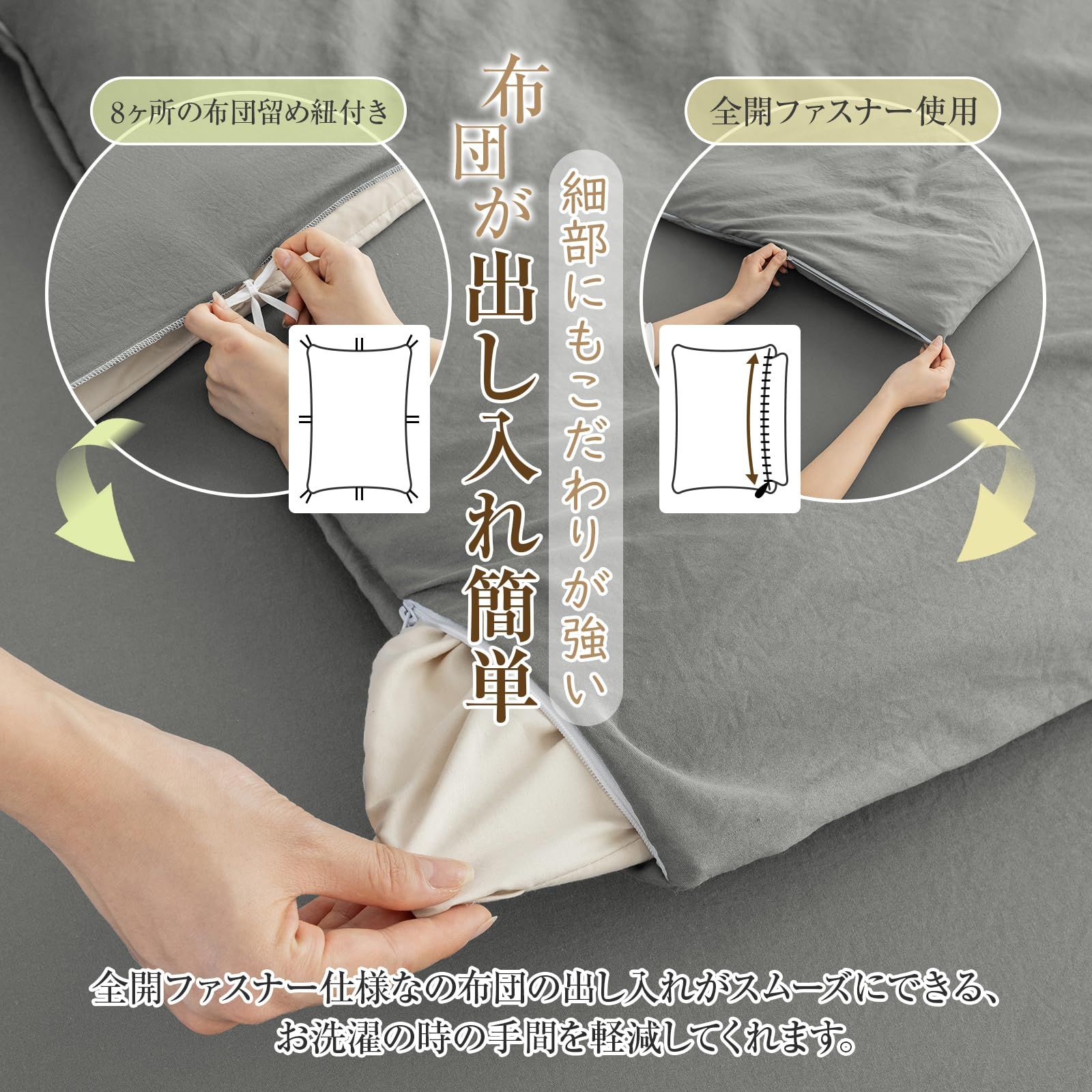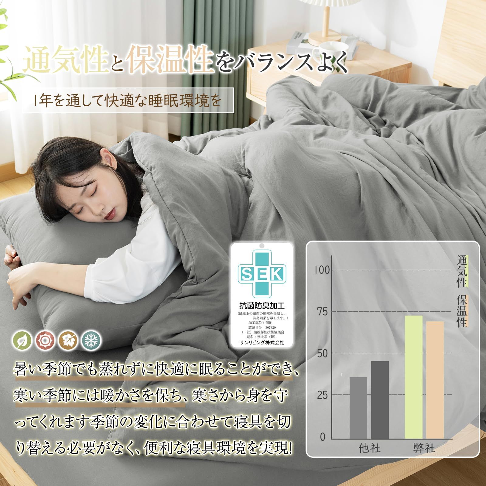 【オールシーズン&和洋通用の仕様】通気性と吸放湿性優れて、夏の場合は、就寝中にかいた汗を吸い取ったり、発散してくれるのでいつでもサラサラとした肌触り。冬の時、カバーの繊維と繊維の間に暖かな空気をためてくれるので、布団の中を暖かく保ったりするという役割もあります。オールシーズン快適な寝心地が楽しめます。和洋どんなテイストのお部屋にも馴染みやすい。自家用でも、ご両親、友人にプレゼントとしてもおすすめします。洗い替え用、来客用としては最高です。