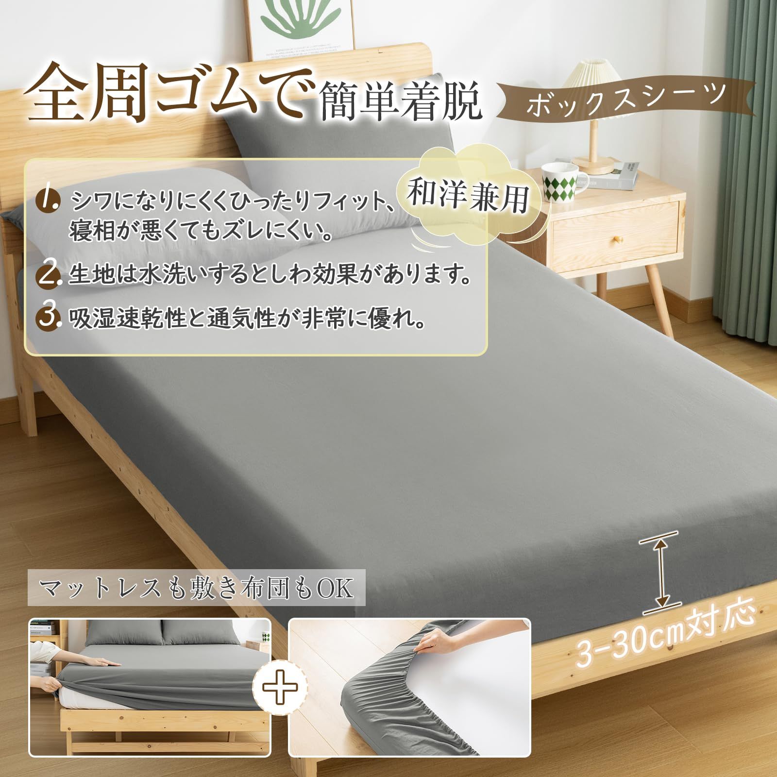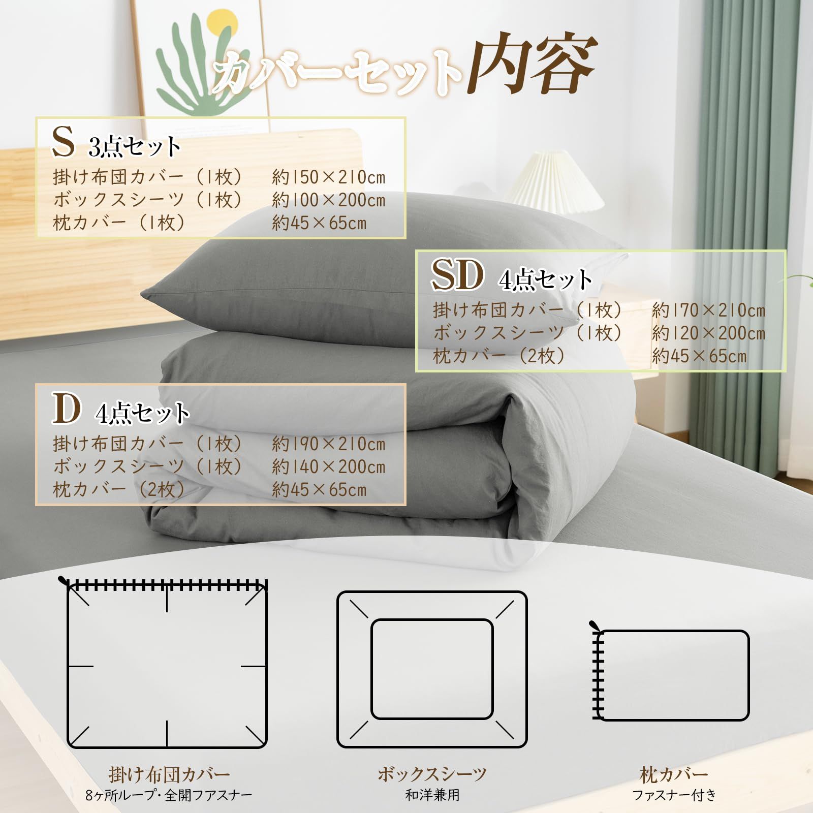 【寝具カバーセット内容・仕様】 ①掛け布団カバー・150x210cm(1枚):片側に丈夫な210cm長さのファスナーを使用、布団留め紐8ヶ所付き。②ボックスシーツ・100X200+30cm(1枚):全周ズレ防止ゴム付き、高さ3-28cmの敷き布団とマットレスの底まで包むことが可能。 ③枕カバー・45X65cm(1枚):ファスナー付きで出し入れが簡単です。※表記サイズより多少小さくなる可能性があります(キルティング製品許容範囲+5%-3%) 。「洗い加工」を施されたポリエステル100%の素材で、洗濯や使用するごとにさらに柔らかくなり、肌馴染みも良くなります。