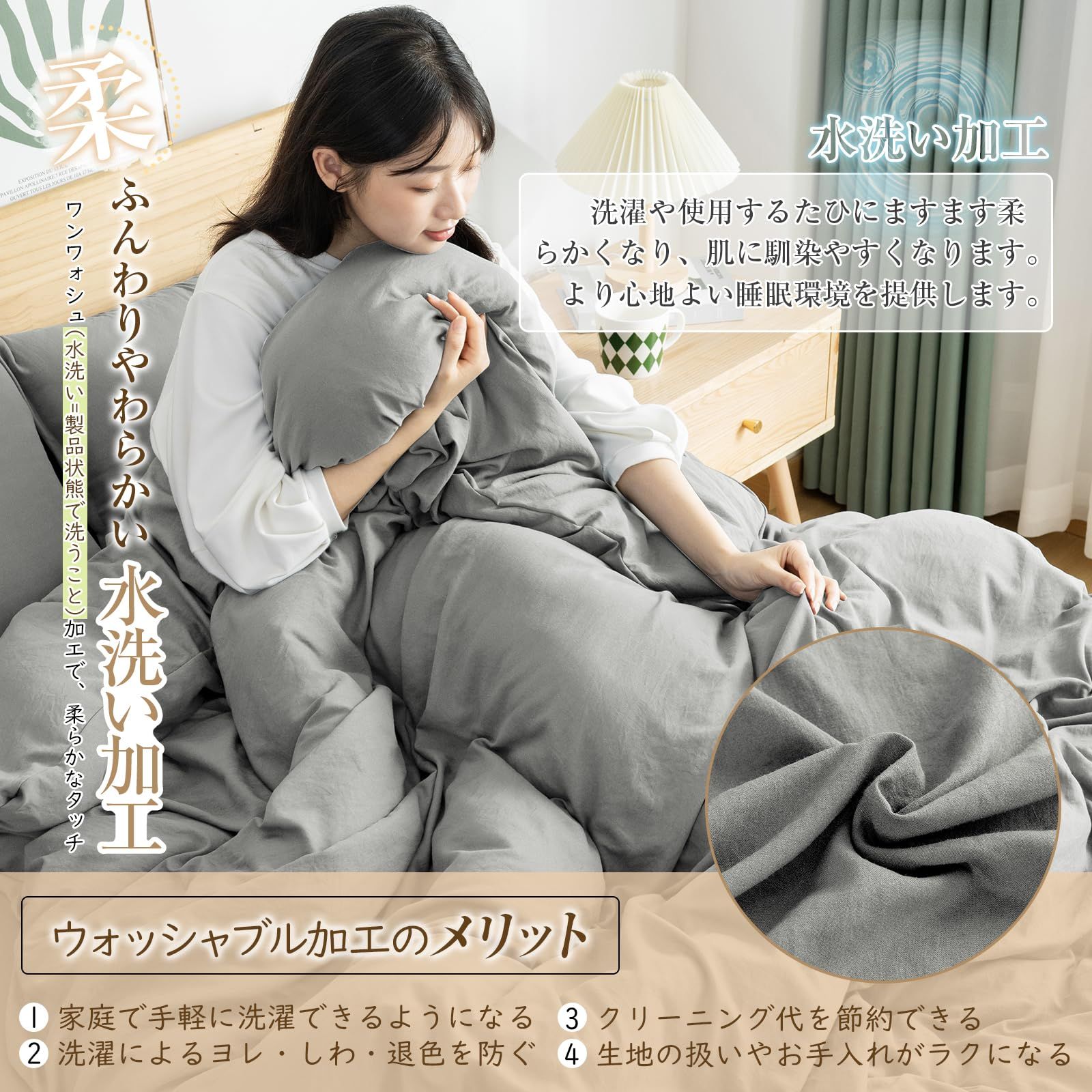 【洗いざらし加工・超柔らかな肌触り】 ナチュラルな肌なじみ洗いさらし寝具カバセット! 洗いざらしとは何度も洗って風合いが自然になったものです。お使いいただく初めから自然な風合いや、やわらかな肌触りを楽しめるように「洗い加工」を施しています。この加工を施した寝具カバーセットは、洗濯や使用するごとにさらに柔らかくなり、肌馴染みも良くなります。毎日素肌に触れるカバーは、いつも清潔に。四季を通じて長くご愛用いただけます。