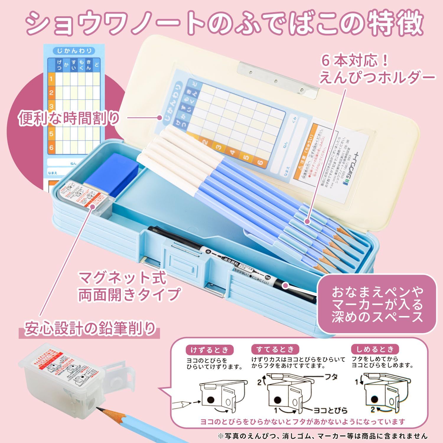 【仕様】両面開き【仕様】鉛筆ホルダー6本対応【付属】鉛筆削り【本体サイズ】幅9.5cm×高さ24.5cm×奥行3.5cm【特長】安心の日本製