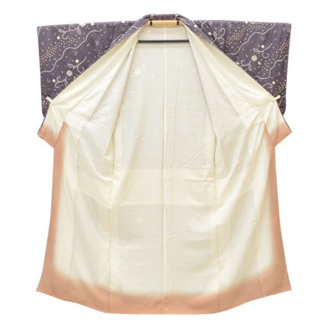 優美な紫色に辻が花文様が織りなす、正絹の小紋でございます。(絹ならではのしなやかな風合いと、お洒落な雰囲気が魅力のお出かけ着として、またセミフォーマルな装いにもふさわしいのお品でございます。)紫色の辻が花文様の正絹(絹SILKシルク)の小紋でお洒落な雰囲気です