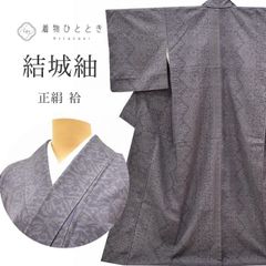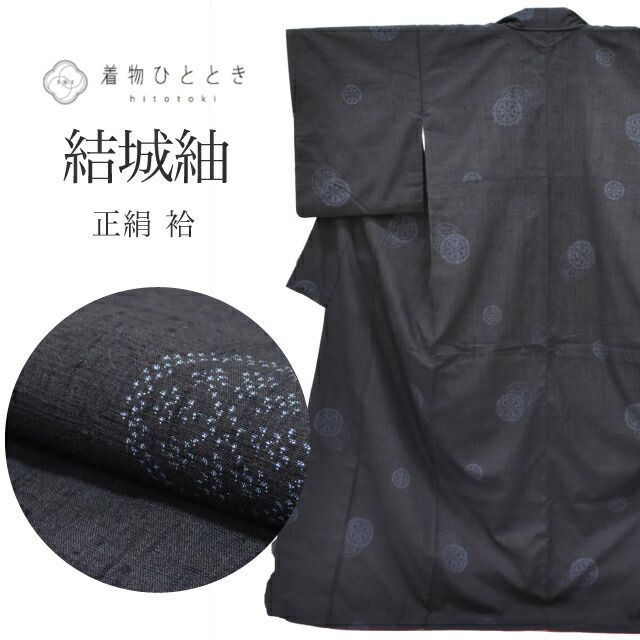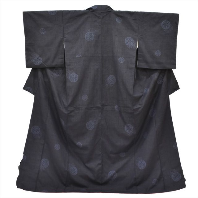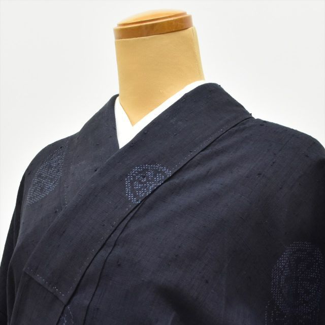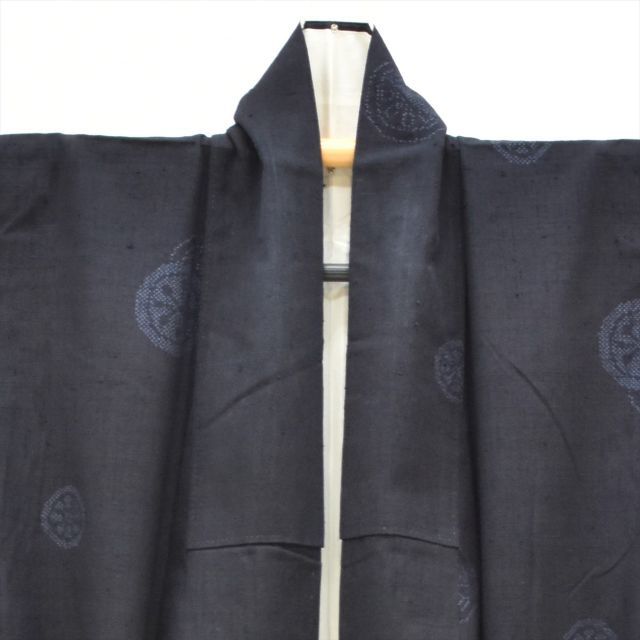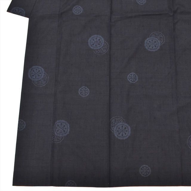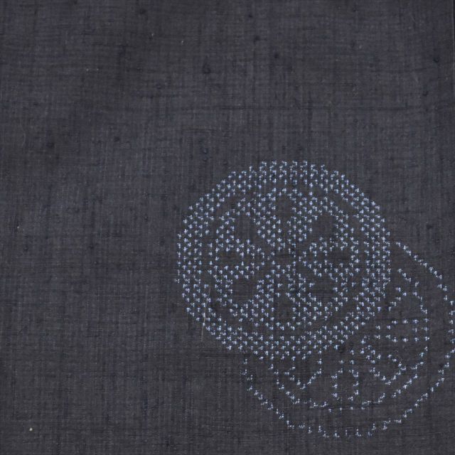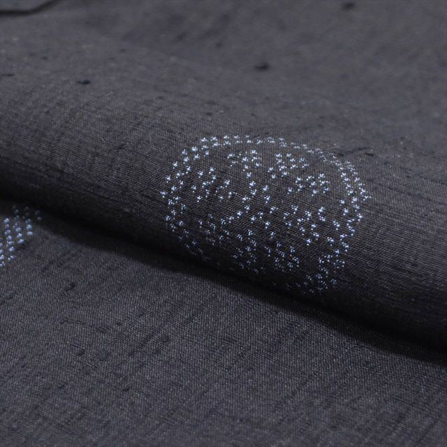 紺色に源氏車文様が織り込まれた柔らかい手織りのリサイクルの結城紬です。