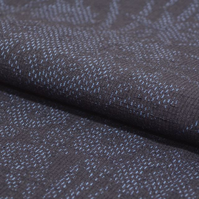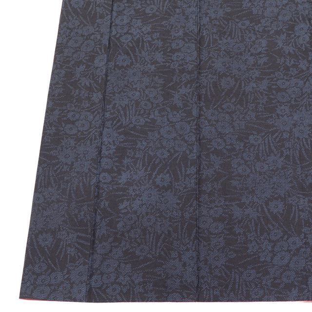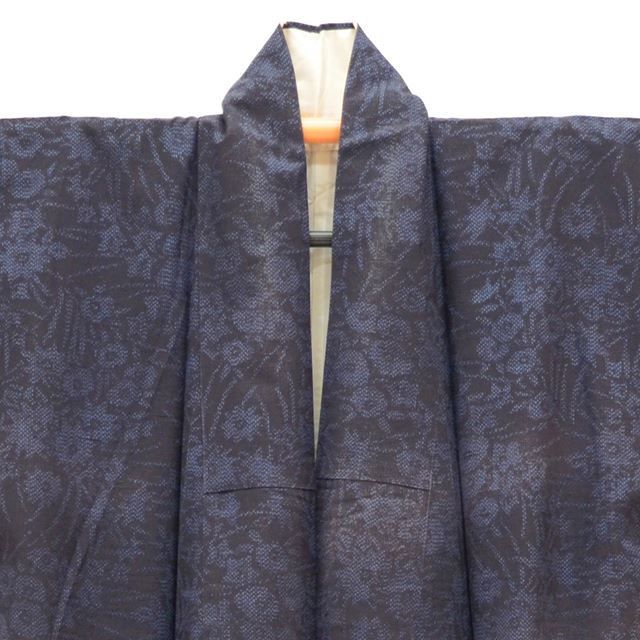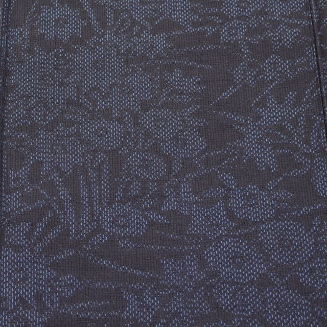 紺色に花文様が織り込まれた、柔らかい手触りのリサイクル結城紬です。