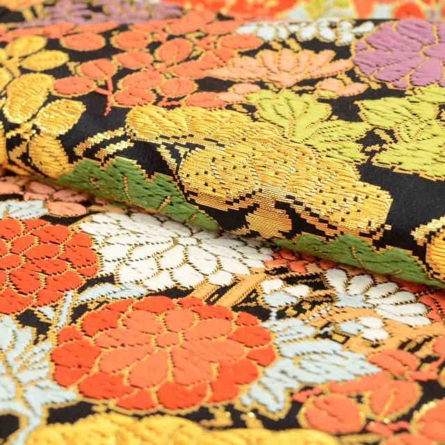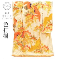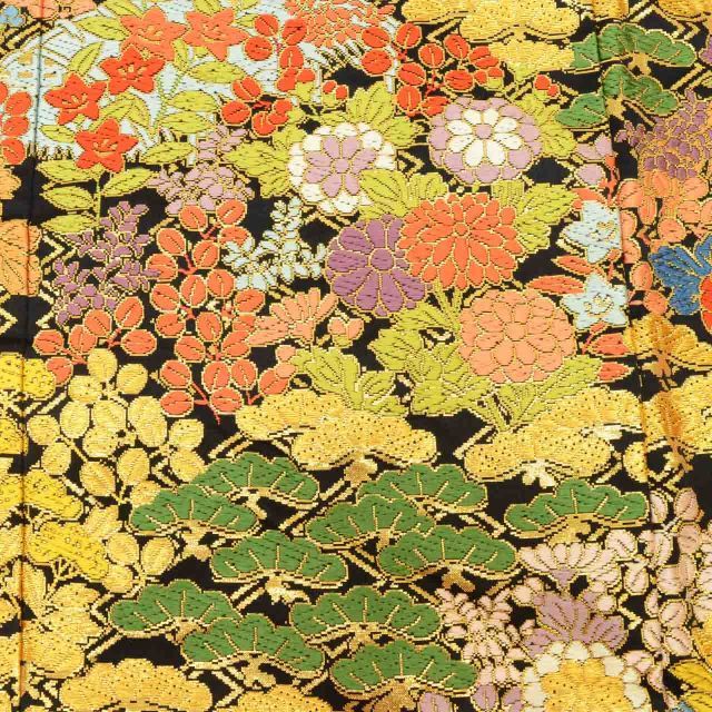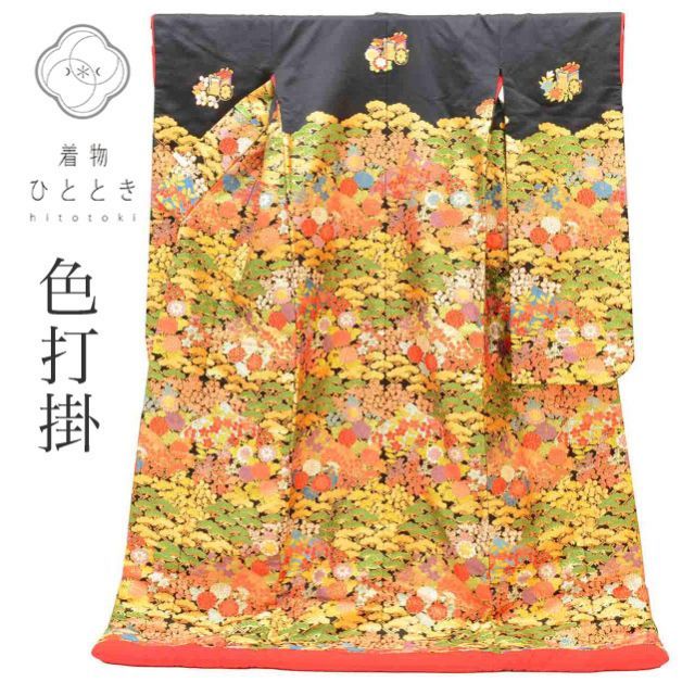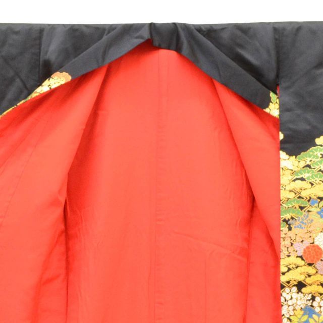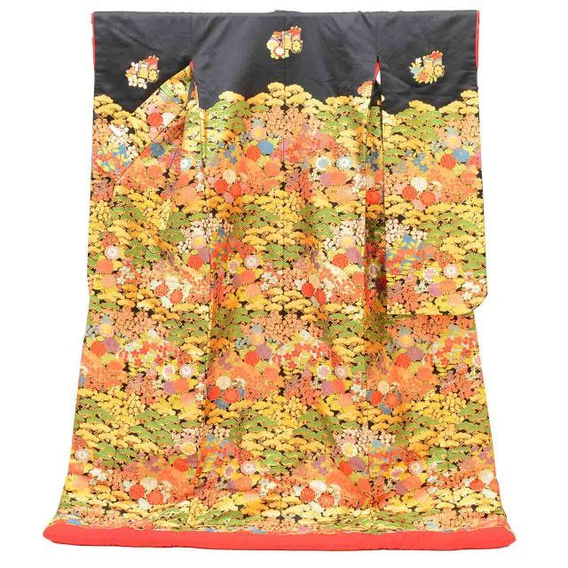 黒色に彩り松文様があしらわれた、華やかなリサイクルの色打掛です。